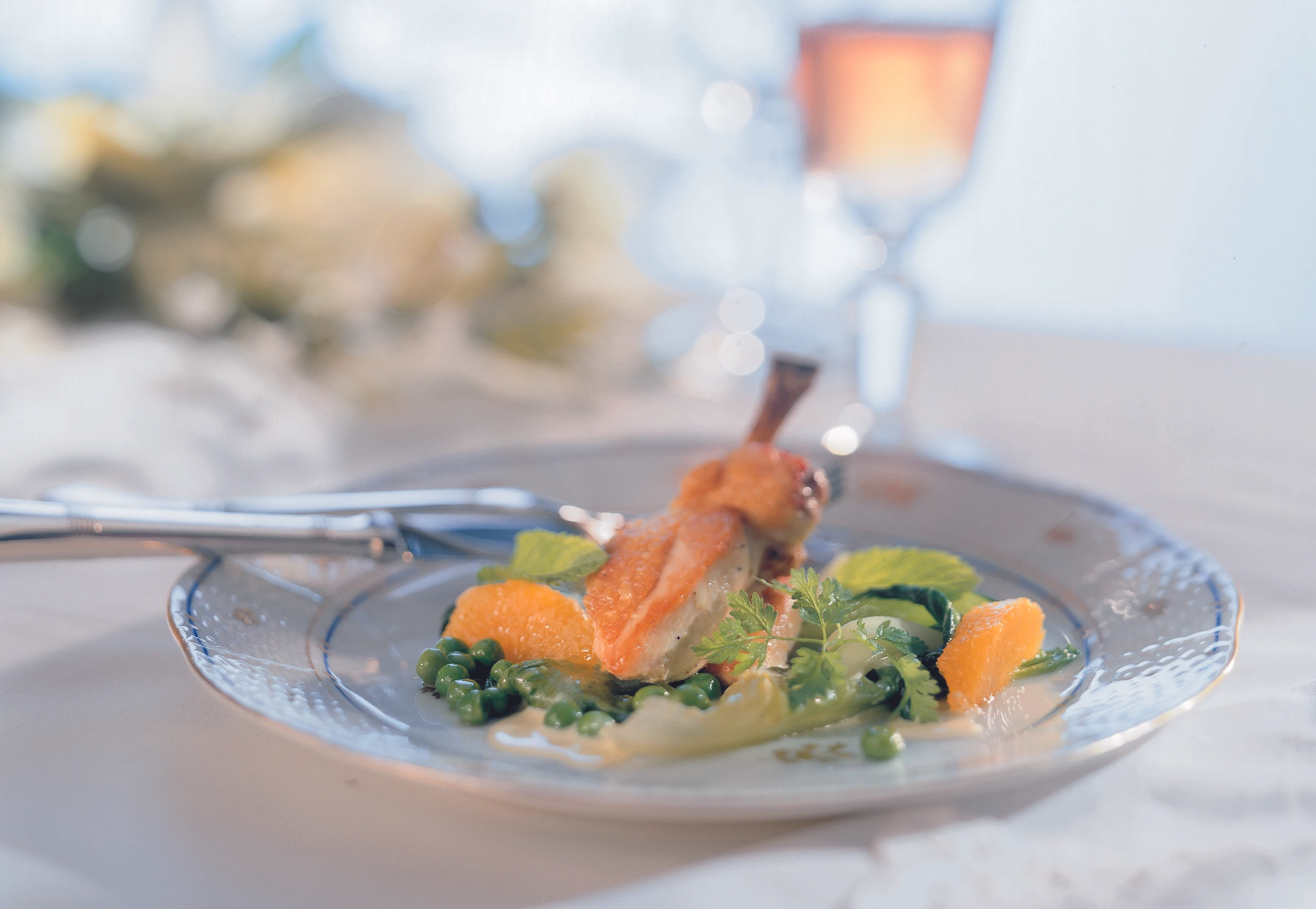 Für die Sauce Dotter mit Wein, Orangensaft, abgeriebener Orangenschale, Hühner-Bratensaft und je einer Prise Salz und Zucker verrühren und über Wasserdampf dickcremig aufschlagen. Mischung vom Dampf nehmen und Crème fraîche einrühren.