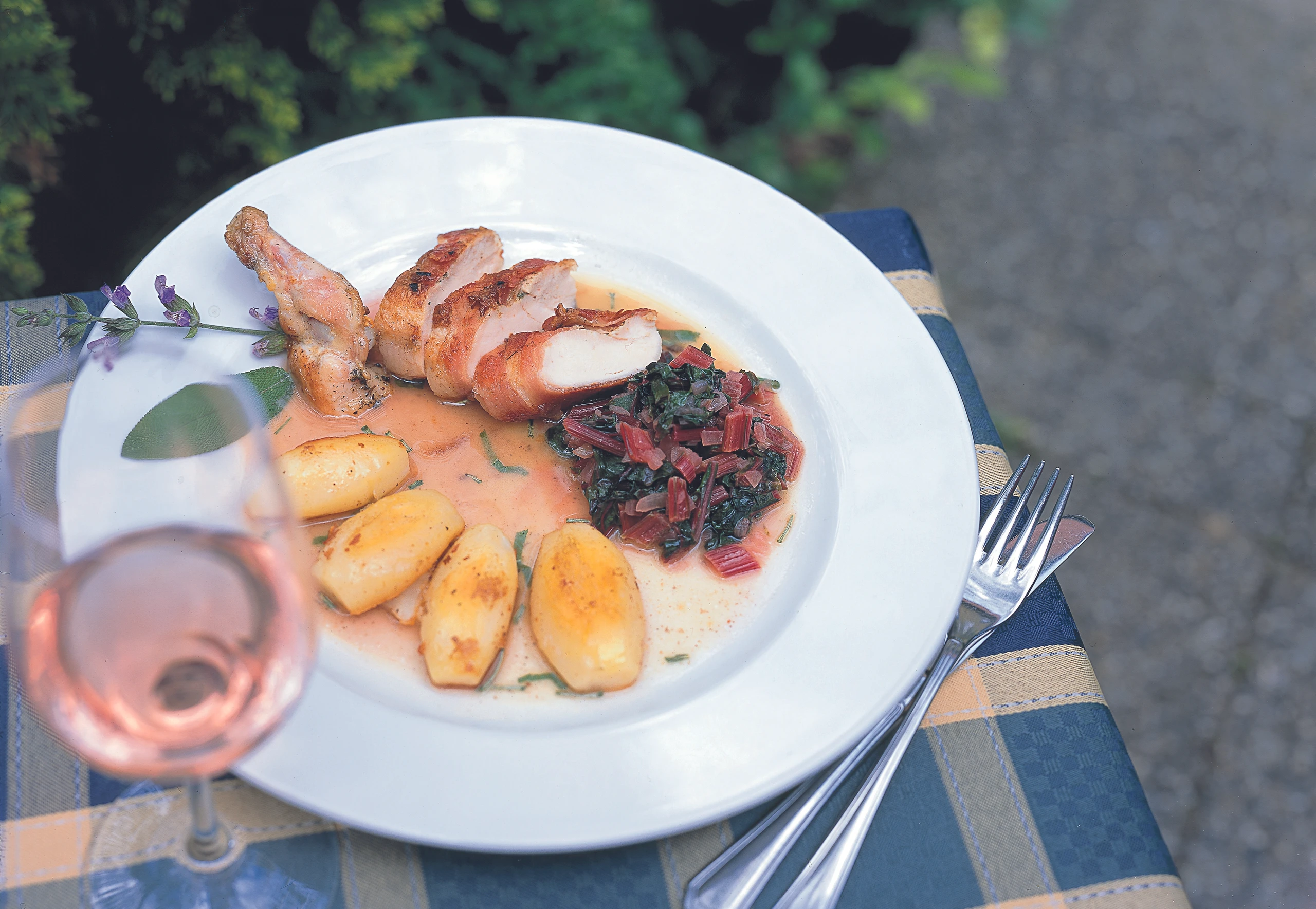 - Fleisch warm stellen. Im Bratrückstand Salbei kurz anschwitzen, mit Suppe aufgießen und einkochen. Hendlbrust in Scheiben schneiden, mit dem Salbeisafterl, Mangold und Kartoffeln servieren.