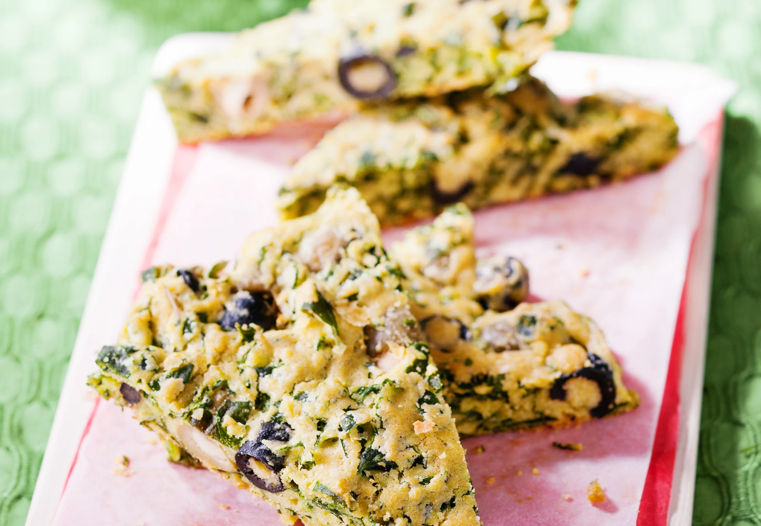 Masse auf dem Blech verstreichen und im Rohr (mittlere Schiene) ca. 30 Minuten backen. Herausnehmen, kurz abkühlen lassen und portionieren. Dazu passen Blattsalate.
