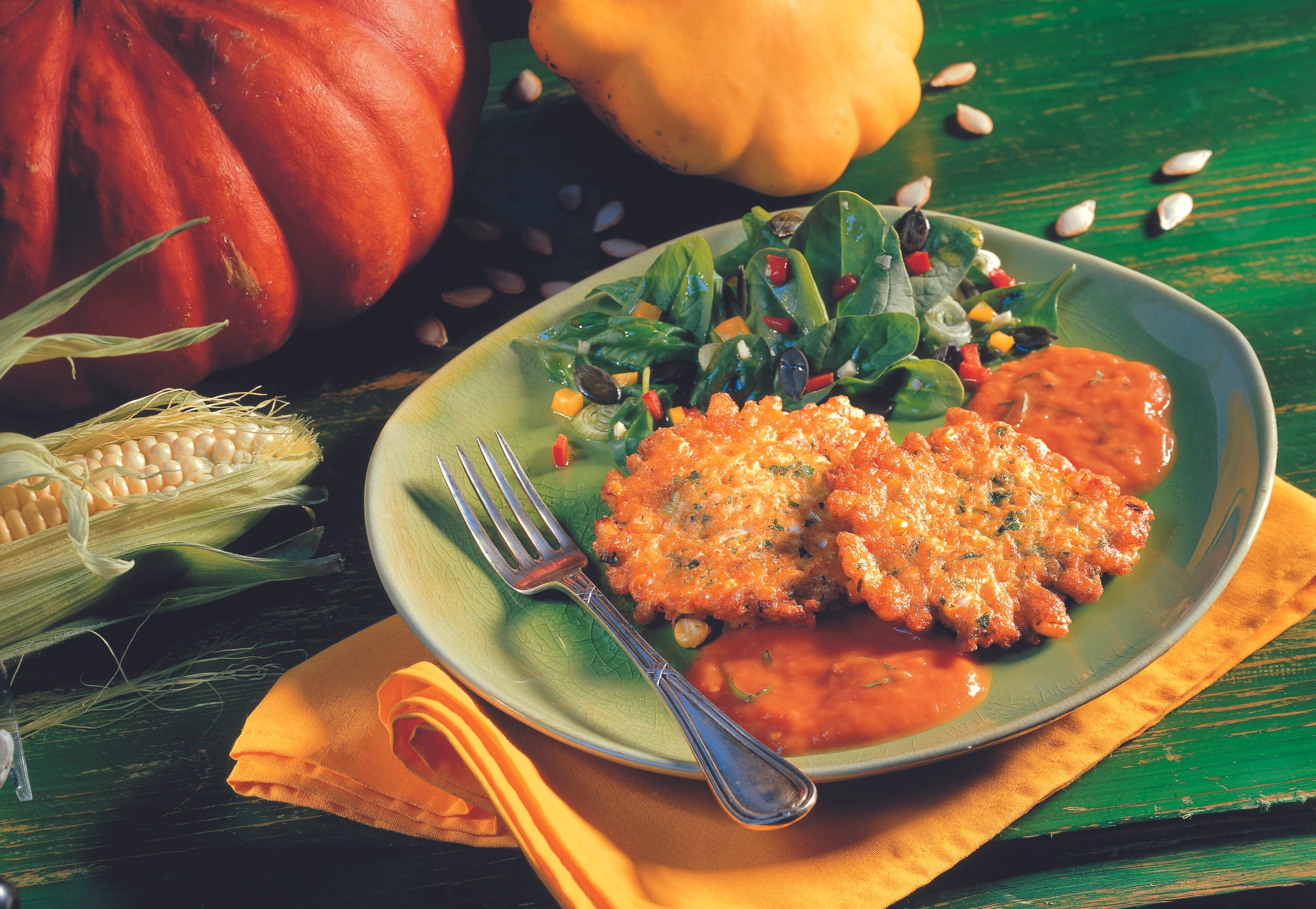 Maisküchlein auf Küchenpapier abtropfen lassen und im vorgeheizten Backrohr warm halten. Ebenso den restlichen Teig verarbeiten.