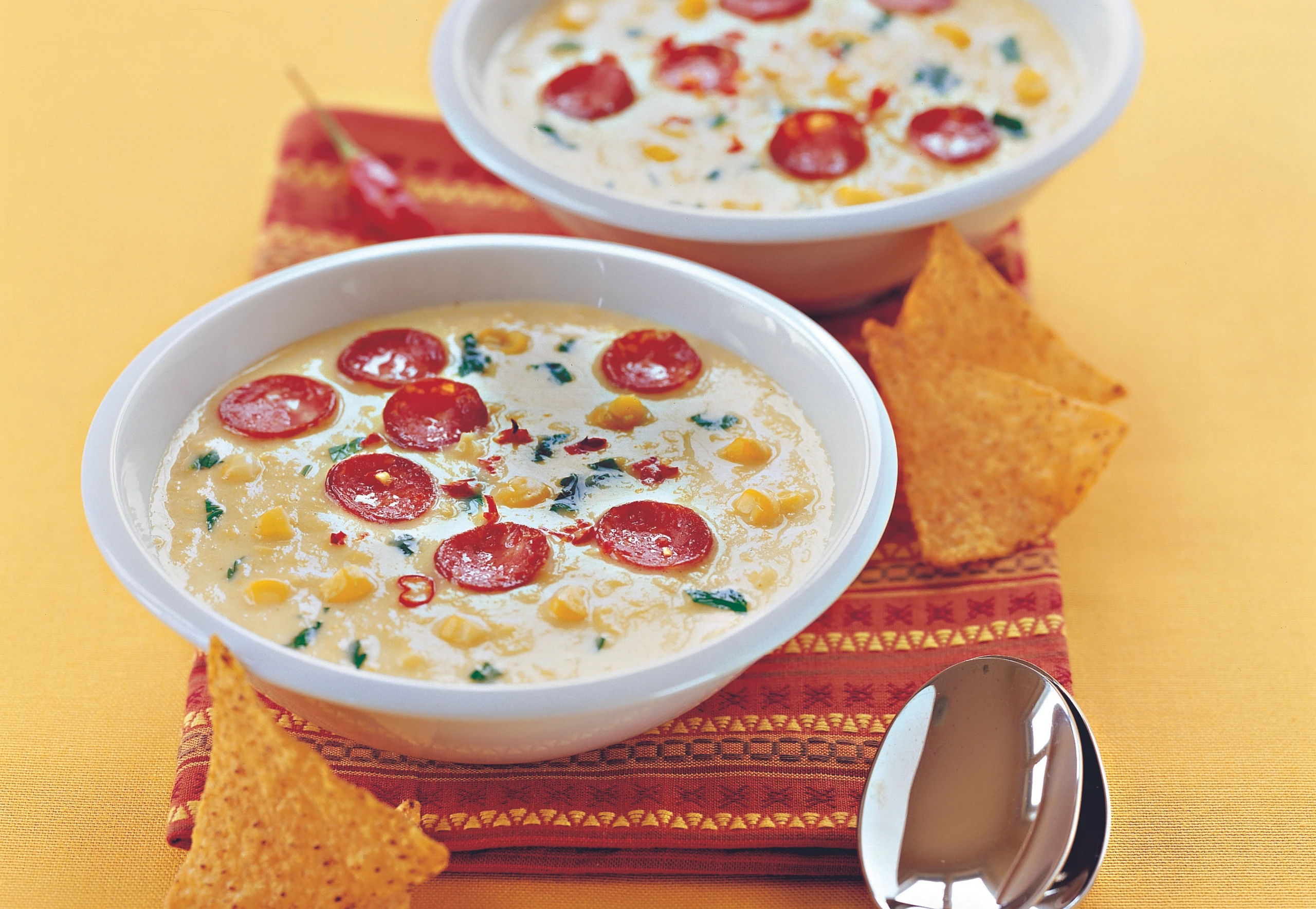 Zwiebel und Knoblauch schälen und klein schneiden. Mais, Zwiebel und Knoblauch im Öl hell anschwitzen. Mit Suppe und Obers aufgießen und bei mittlerer Hitze ca. 10 Minuten köcheln.