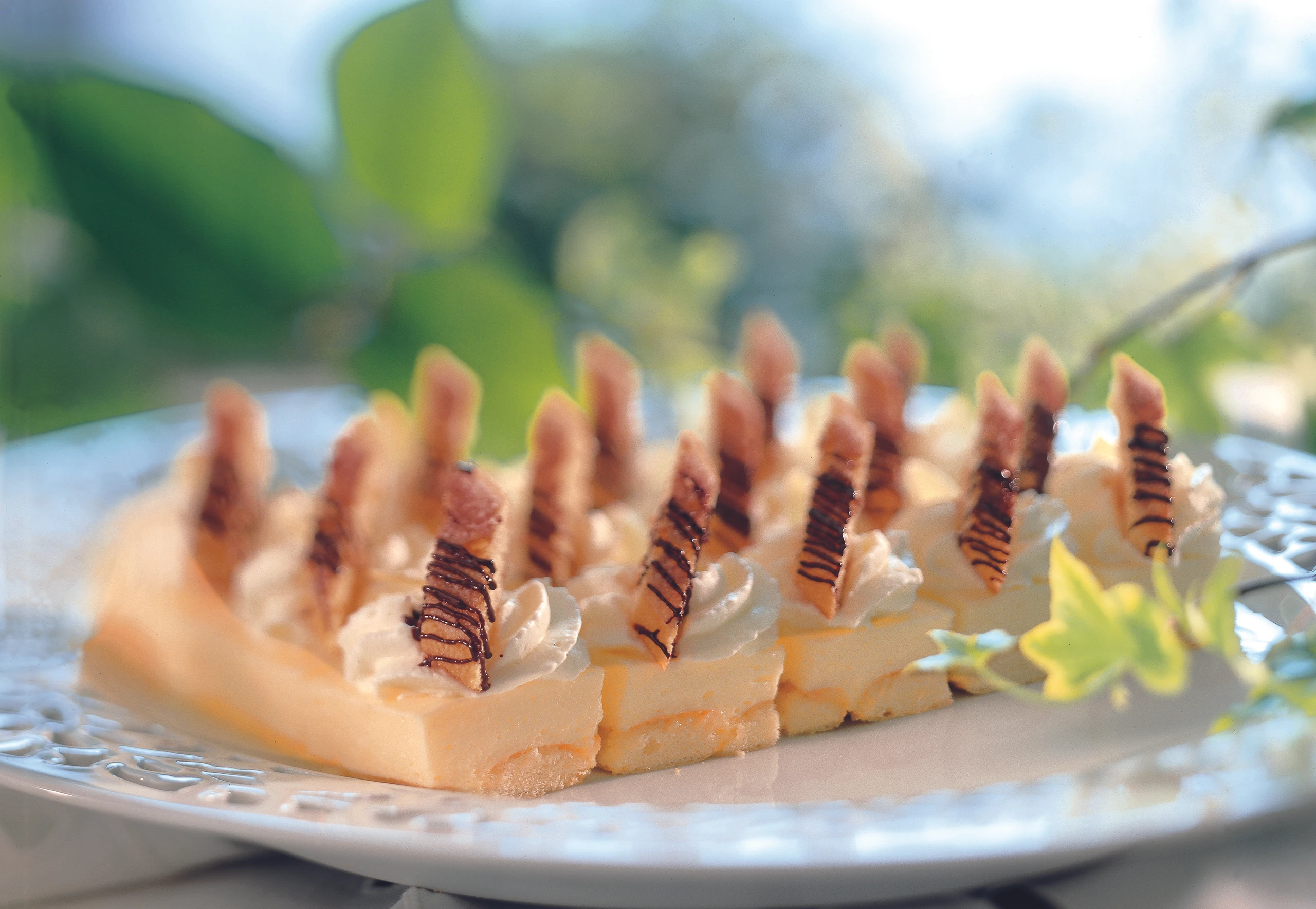 Obers schlagen und in einen Dressiersack mit Sterntülle füllen. Malakoffmasse aus der Form stürzen und in ca. 3 cm große Würfel schneiden. Würfel mit Schlagobers und Biskotten garnieren.