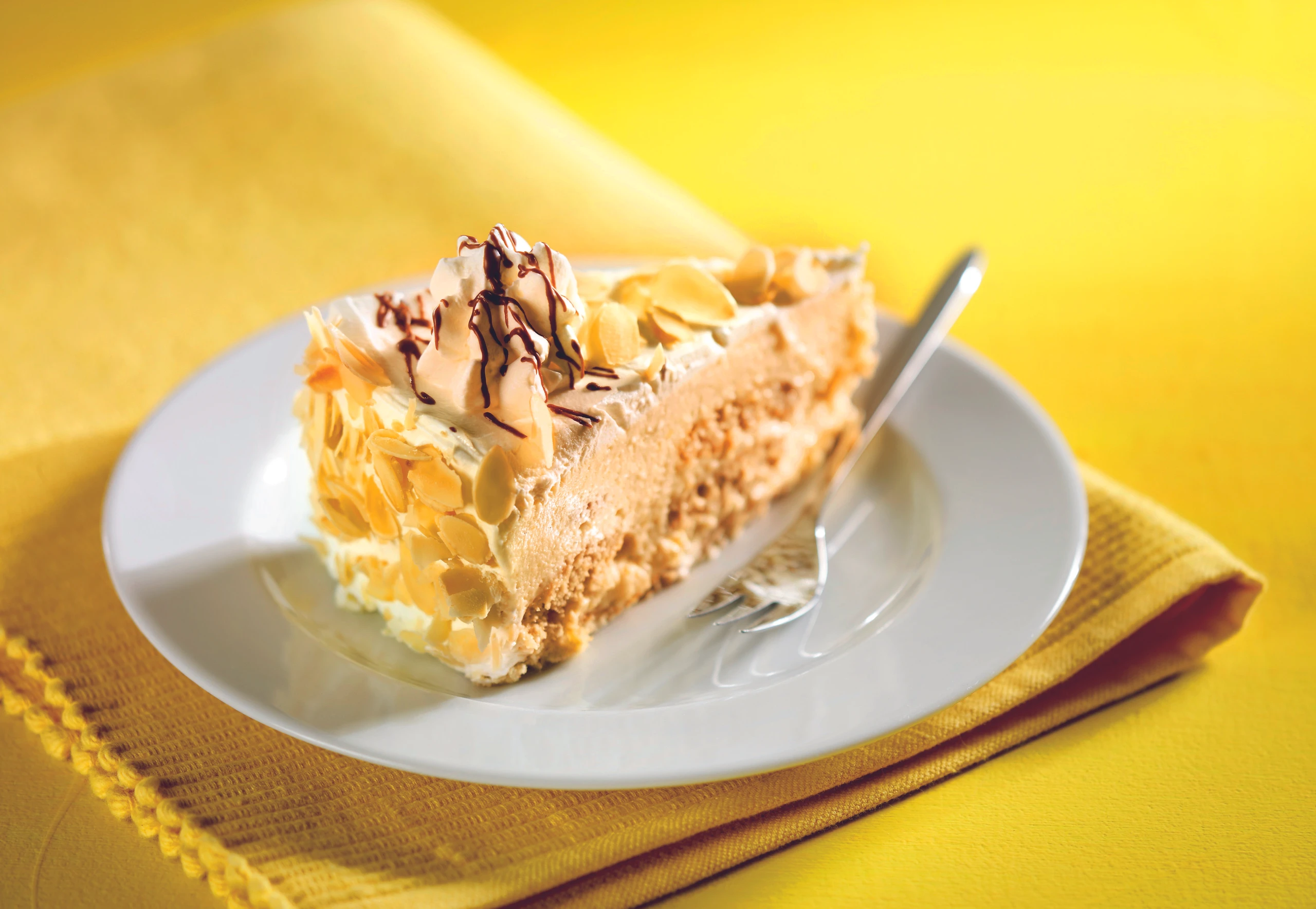 - Für die Garnitur Obers schlagen, ein Drittel davon in einen Dressiersack mit Sterntülle füllen. Torte aus der Form lösen und mit dem übrigen Obers rundum einstreichen. Torte mit Obers-Rosetten verzieren, mit Mandeln und eventuell geschmolzener Kuvertüre garnieren.