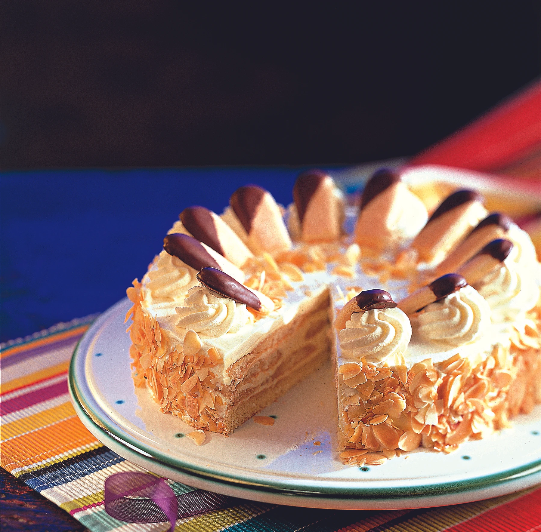 - Für die Garnitur Biskotten in die Schokolade tauchen, Schokolade trocknen lassen. Torte aus der Form nehmen, Obers cremig schlagen, die Torte damit einstreichen und Rosetten auf die Torte dressieren. Torte mit Mandeln und Biskotten garnieren.