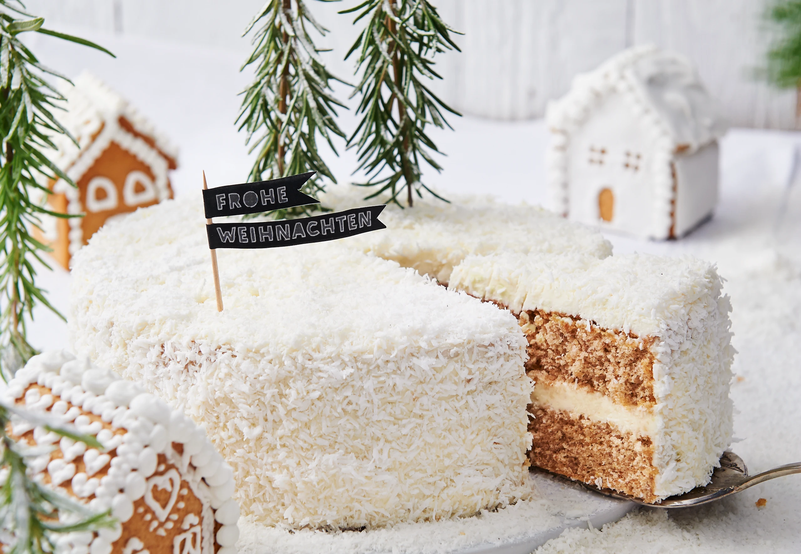 Tortenboden halbieren und mit einem Drittel der Creme füllen. Torte mit der restlichen Creme rundum einstreichen, mit Kokosraspeln einstreuen. Torte, Lebkuchenhäuschen und Rosmarinzweige drapieren und mit Staubzucker bestreuen.