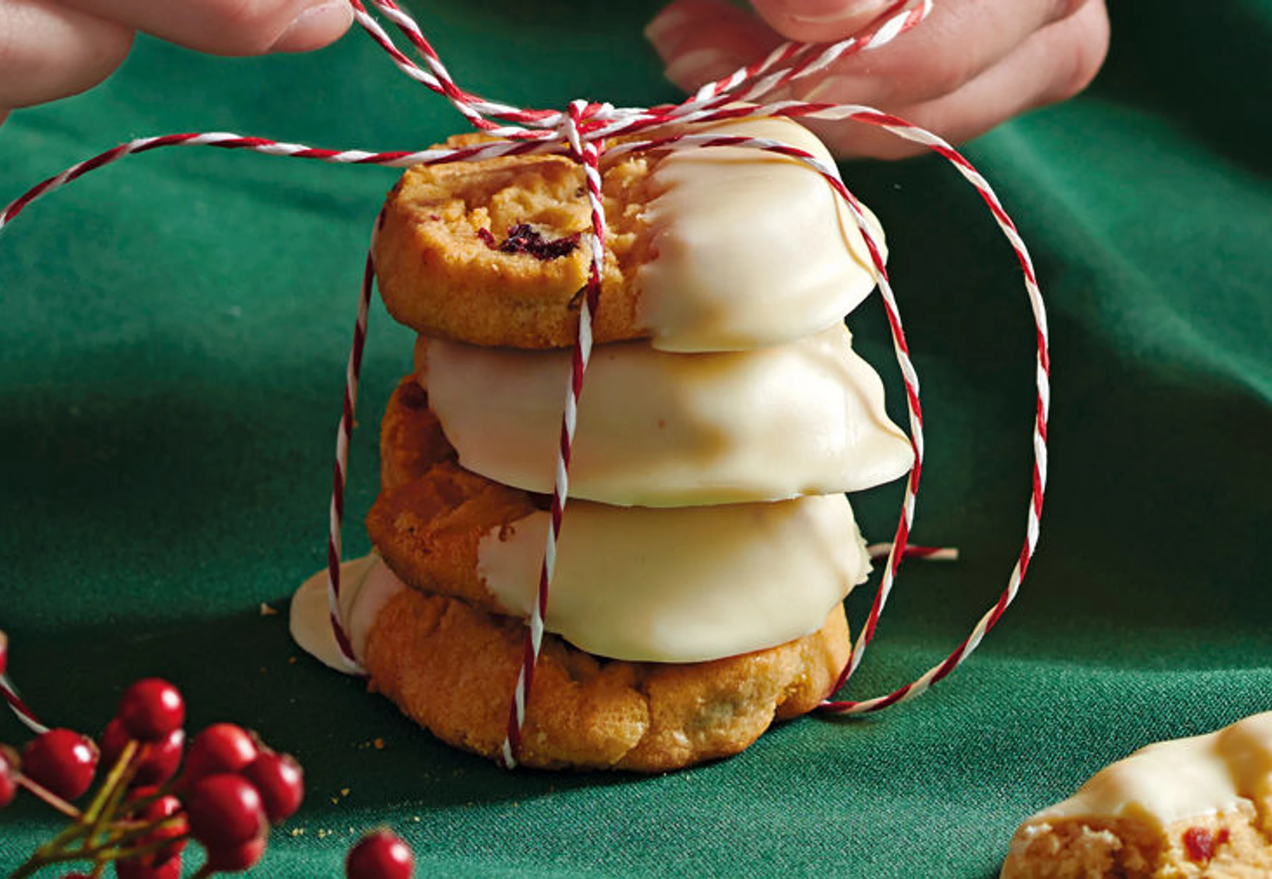 Butter und Zucker ca. 5 Minuten cremig mixen. Ei und Mandarinenschale zugeben und unterrühren. Mehl und Backpulver untermischen. Cranberrys und Schokolade unterkneten. Teig zu 4 Rollen formen, in Frischhaltefolie wickeln und für ca. 2 Stunden kühl stellen.