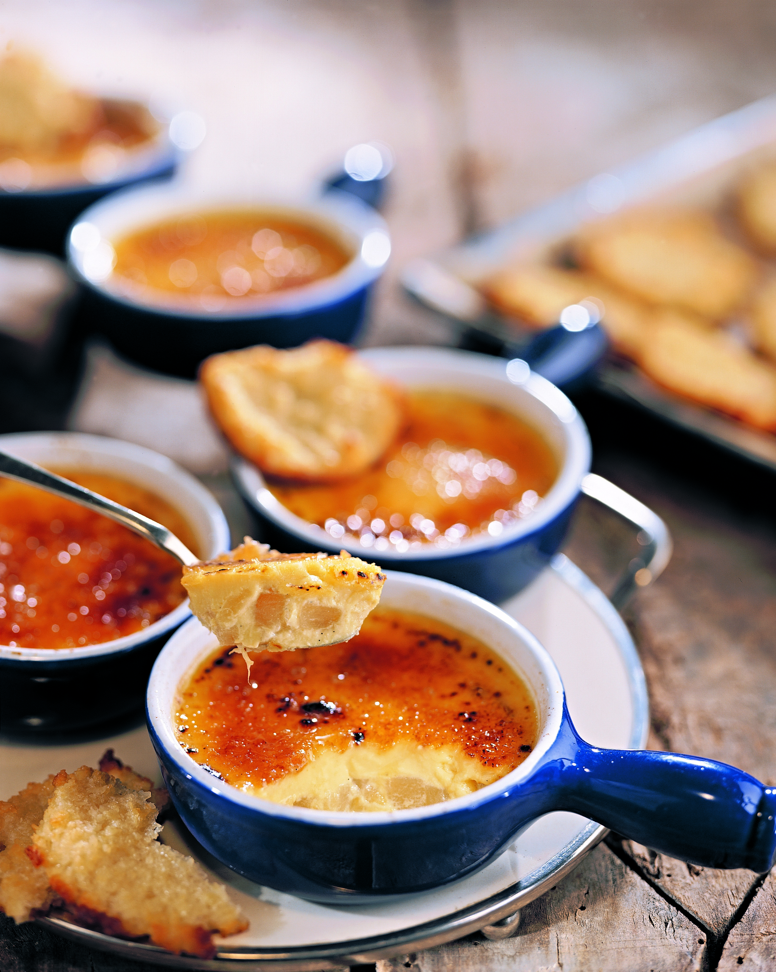 Cremen mit Zucker bestreuen und mit einem Flämmer überkrusten oder im Backrohr (Grillstellung) kurz überbacken (obere Schiene), bis der Zucker karamellisiert. Mit den Mandelplätzchen servieren.