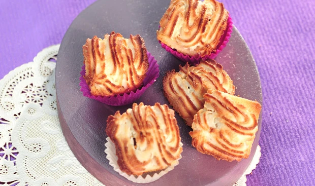 - Für die Makronenmasse Marzipan, restlichen Staubzucker, Zimt, weiche Butter und Eiklar verrühren; die Masse muss dressierfähig sein; je nach Konsistenz des Marzipans evtl. wenig Eiklar dazu geben. Masse in einen Dressiersack mit Sterntülle füllen und auf die Mandeln dressieren. Masse über Nacht an der Luft trocknen lassen.