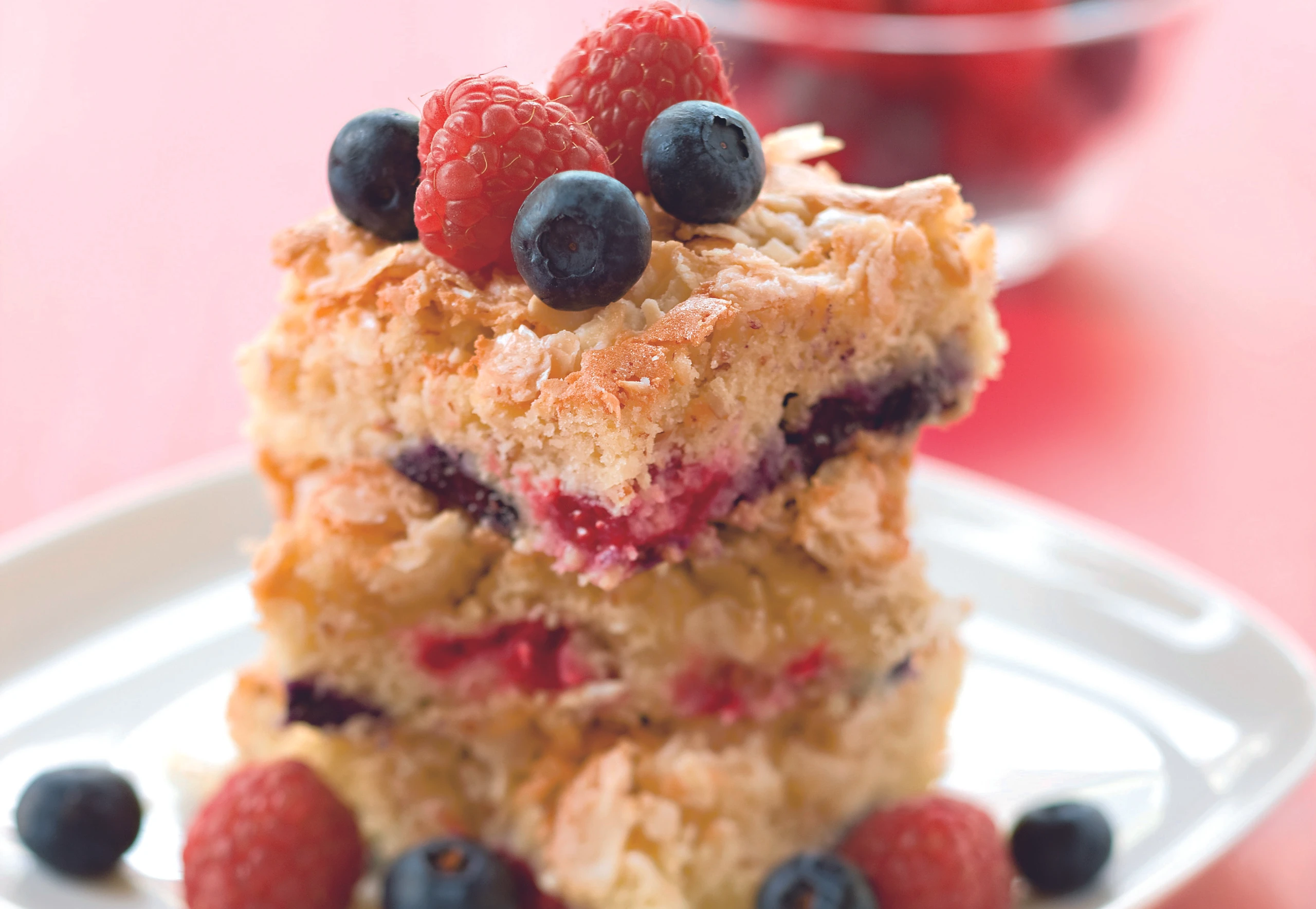 Masse auf dem Blech verstreichen, die Hälfte von den Beeren und den Streusel darauf verteilen. Kuchen im Rohr (mittlere Schiene) ca. 50 Minuten backen. Herausnehmen und auskühlen lassen. Kuchen in Stücke schneiden und mit den übrigen Beeren garniert servieren.