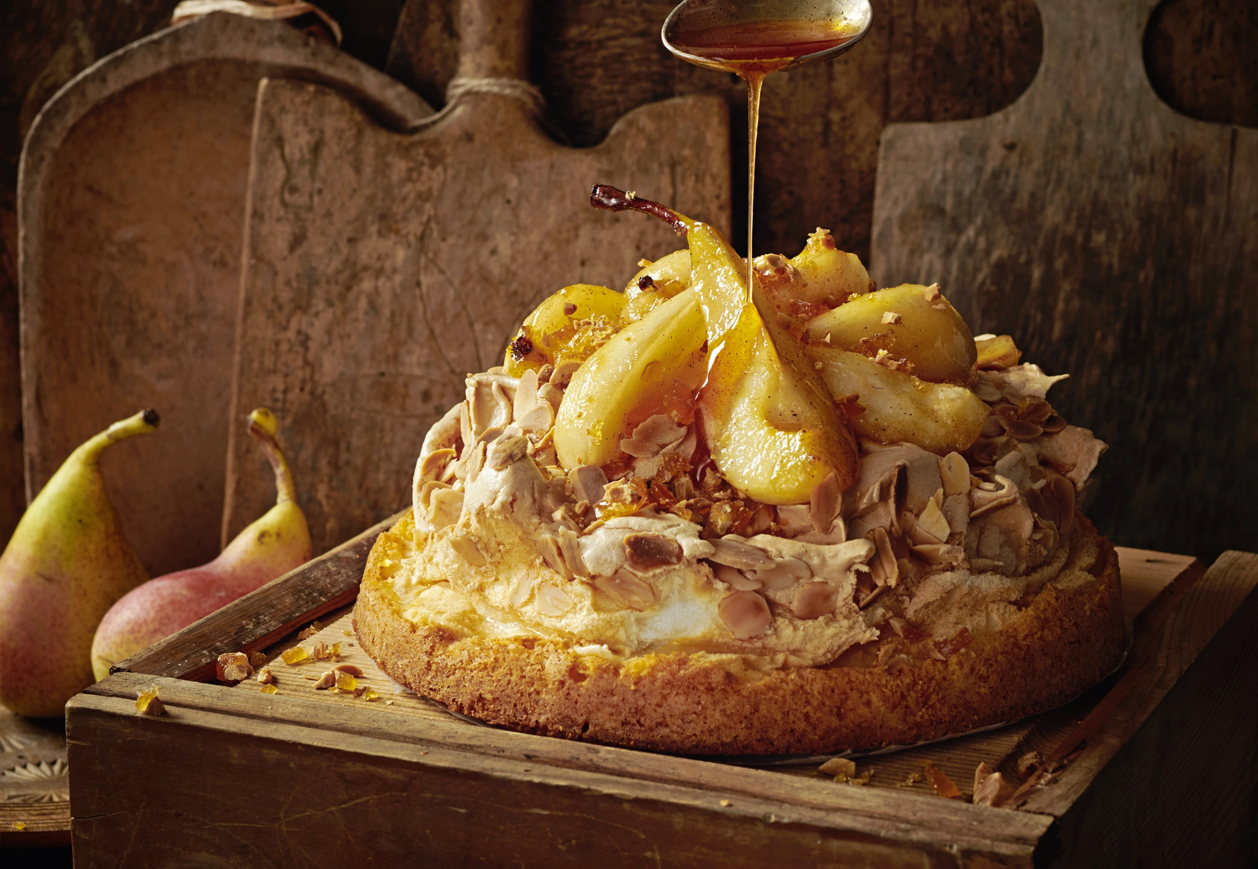 Mandel-Meringue-Kuchen mit karamellisierten Birnen