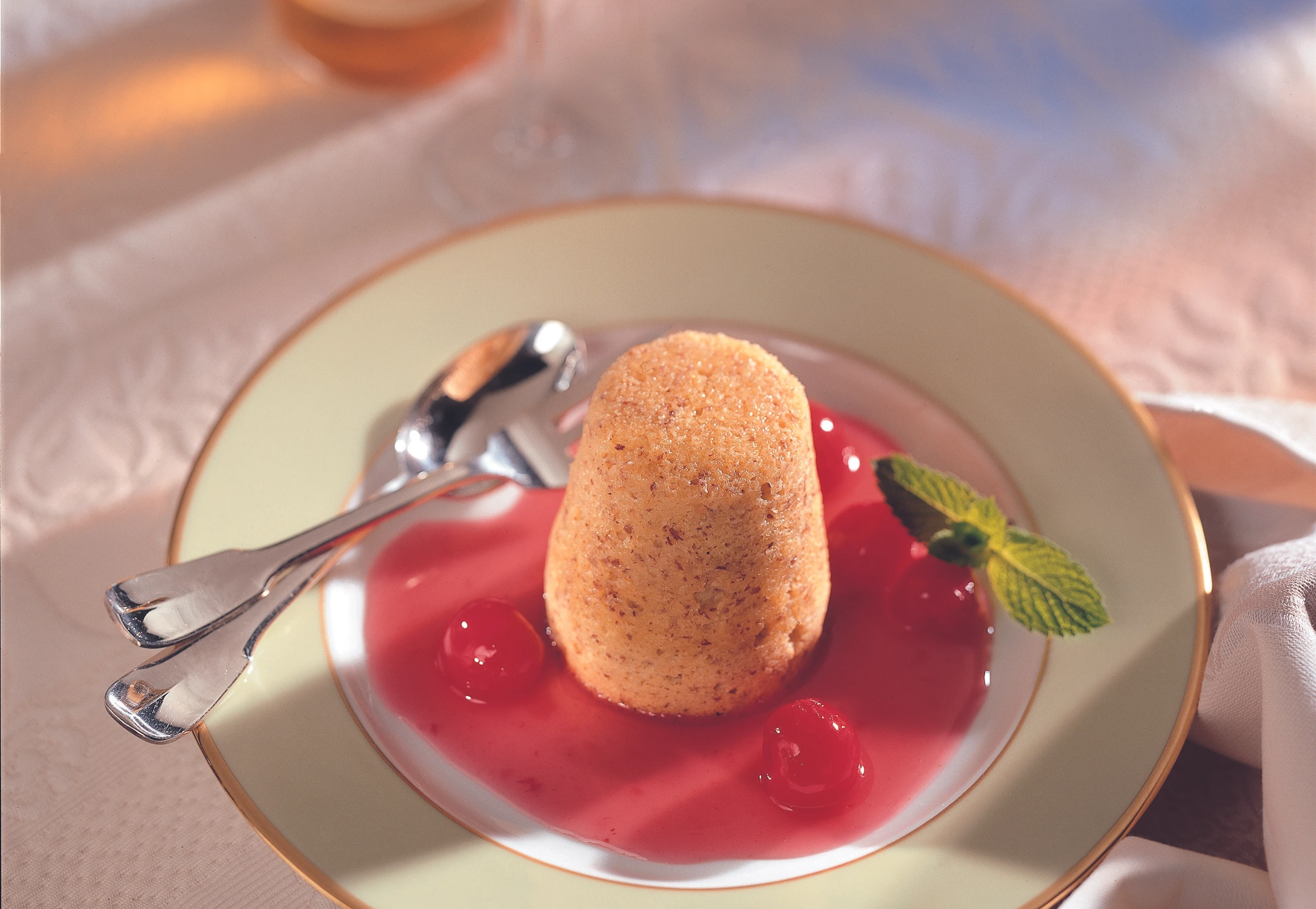 Förmchen bis ca. 1 cm unter den Rand mit der Masse füllen und in eine Metallform (mit dünnem Boden) stellen. Soviel kochendes Wasser zugießen, dass die Förmchen halbhoch im Wasserbad stehen. Puddings im vorgeheizten Rohr (unterste Schiene / Gitterrost) ca. 35 Minuten garen. Puddings aus dem Rohr nehmen, auf Teller stürzen und mit den eingemachten Kirschen und Minze garniert servieren.