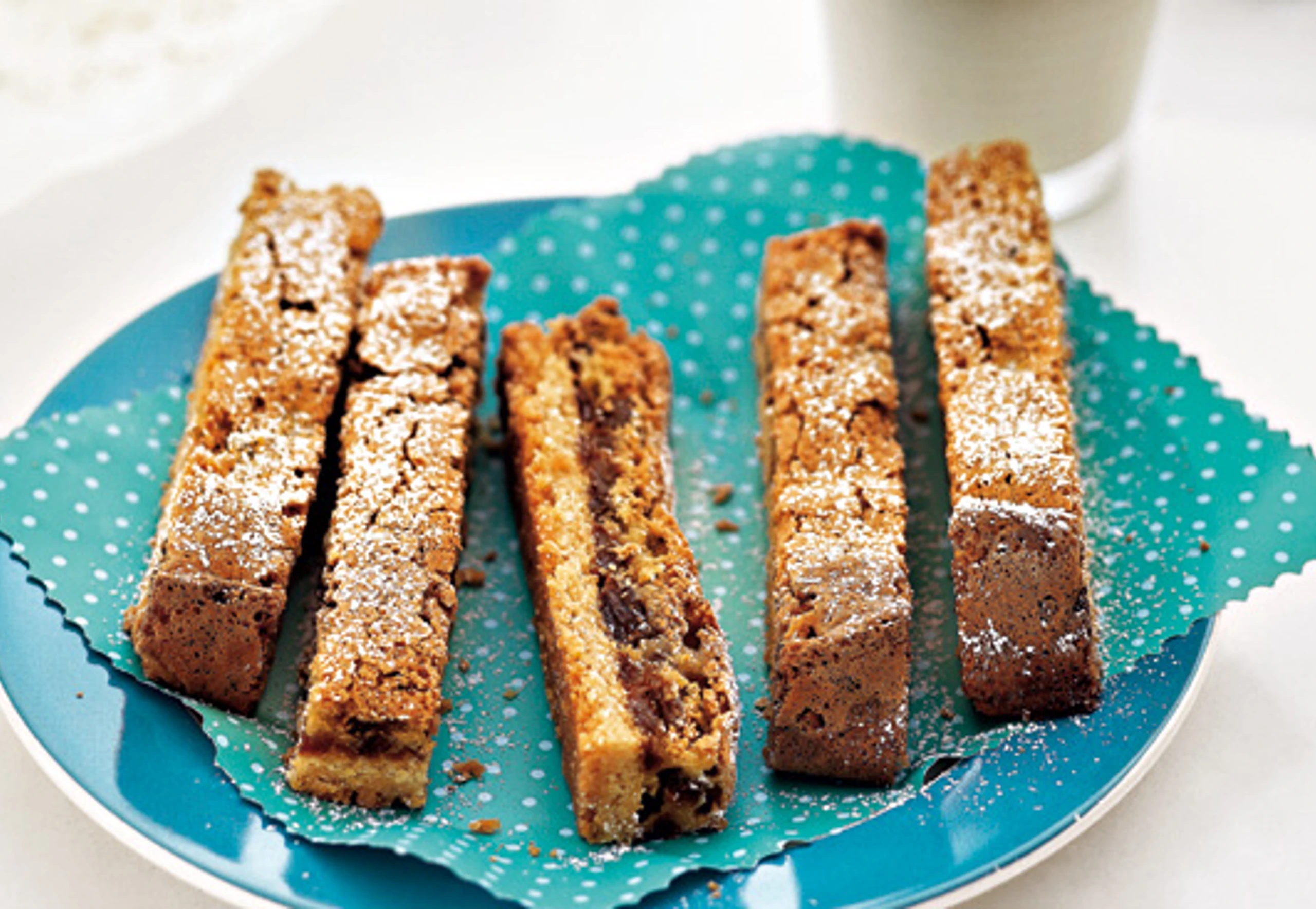 - Für die Fülle Mehl mit Backpulver versieben. Eier mit Zucker schaumig schlagen, Rosinen und Mehlmischung unterrühren.