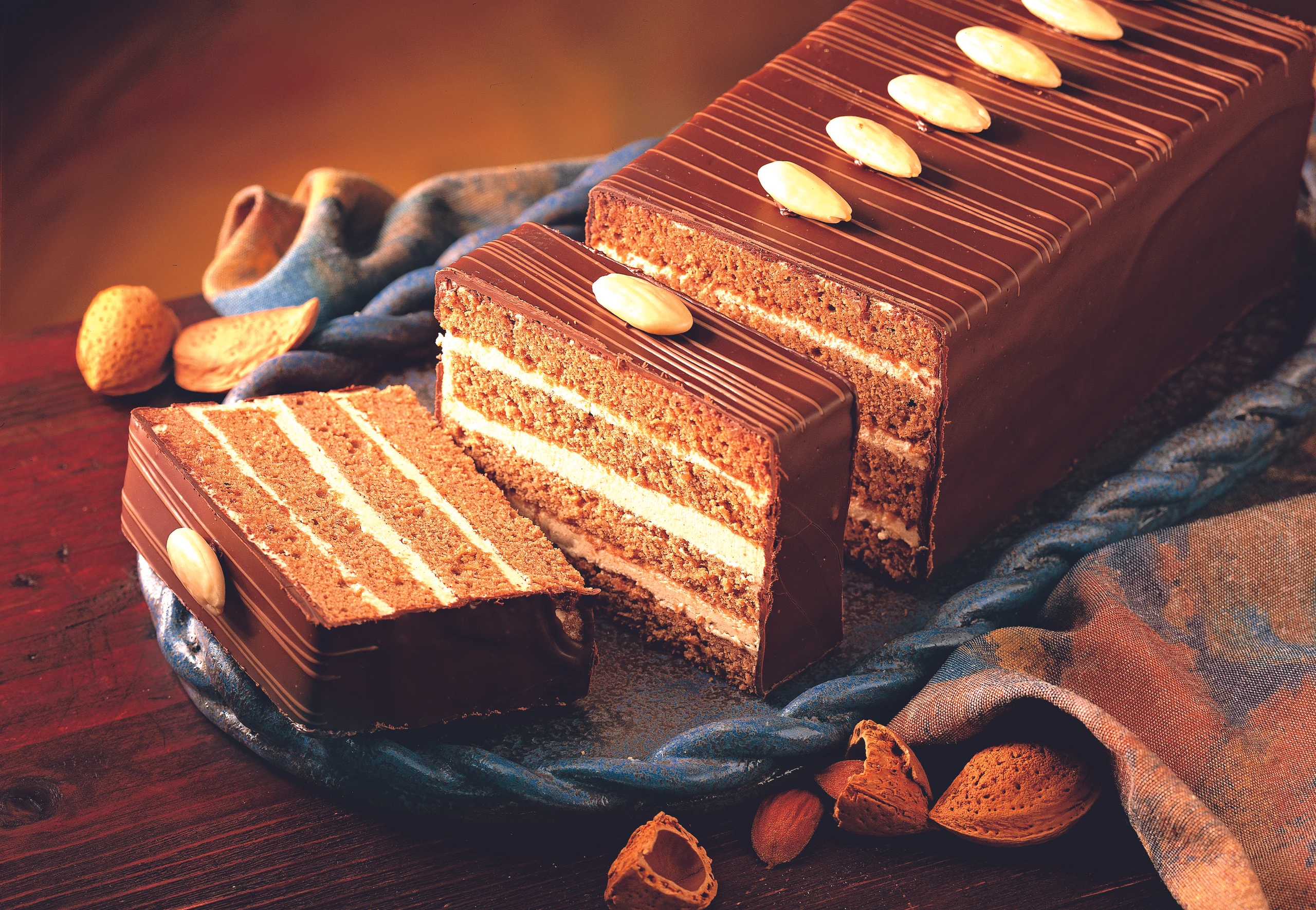 Für die Garnitur Kuvertüre in kleine Stücke brechen und über Wasserdampf schmelzen. Schokolade gleichmäßig auf der Mandelschnitte verstreichen und die abgezogenen Mandeln in gleichen Abständen darauf setzen. Mandel-Schnitte zum Festwerden ca. 1 Stunde in den Kühlschrank stellen.