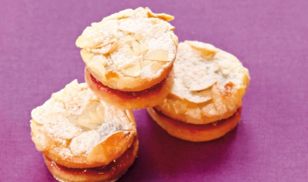 - Rohr auf 160°C vorheizen. 2 Backbleche mit Backpapier belegen. Eine Teighälfte ca. 3 mm dick ausrollen. 50 Scheiben (Ø 4 cm) ausstechen, auf die Bleche legen und im Rohr (mittlere Schiene) 15 Minuten backen. Mit dem Papier von den Blechen ziehen und mit Marmelade bestreichen.