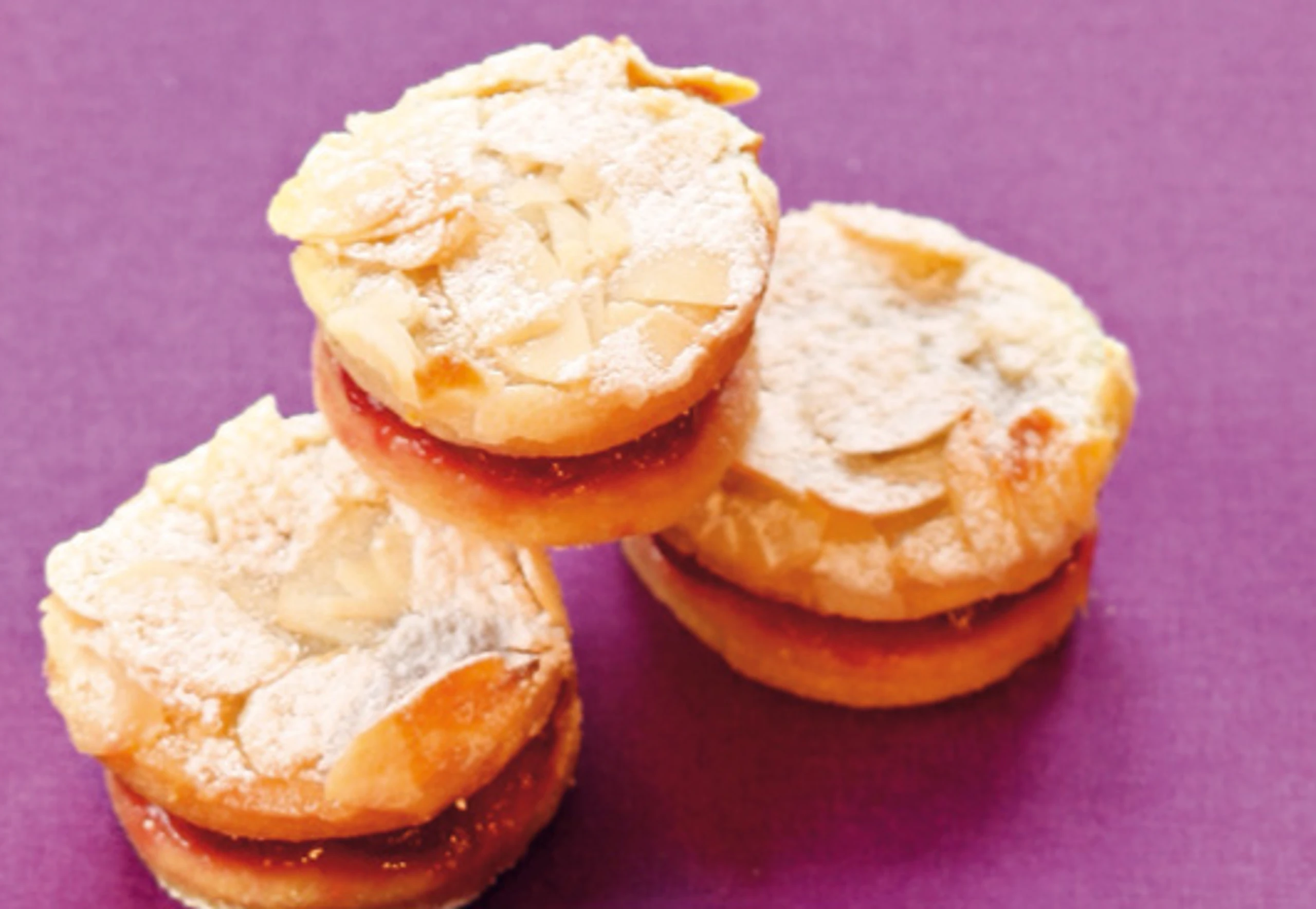 Rohr auf 160°C vorheizen. 2 Backbleche mit Backpapier belegen. Eine Teighälfte ca. 3 mm dick ausrollen. 50 Scheiben (Ø 4 cm) ausstechen, auf die Bleche legen und im Rohr (mittlere Schiene) 15 Minuten backen. Mit dem Papier von den Blechen ziehen und mit Marmelade bestreichen.