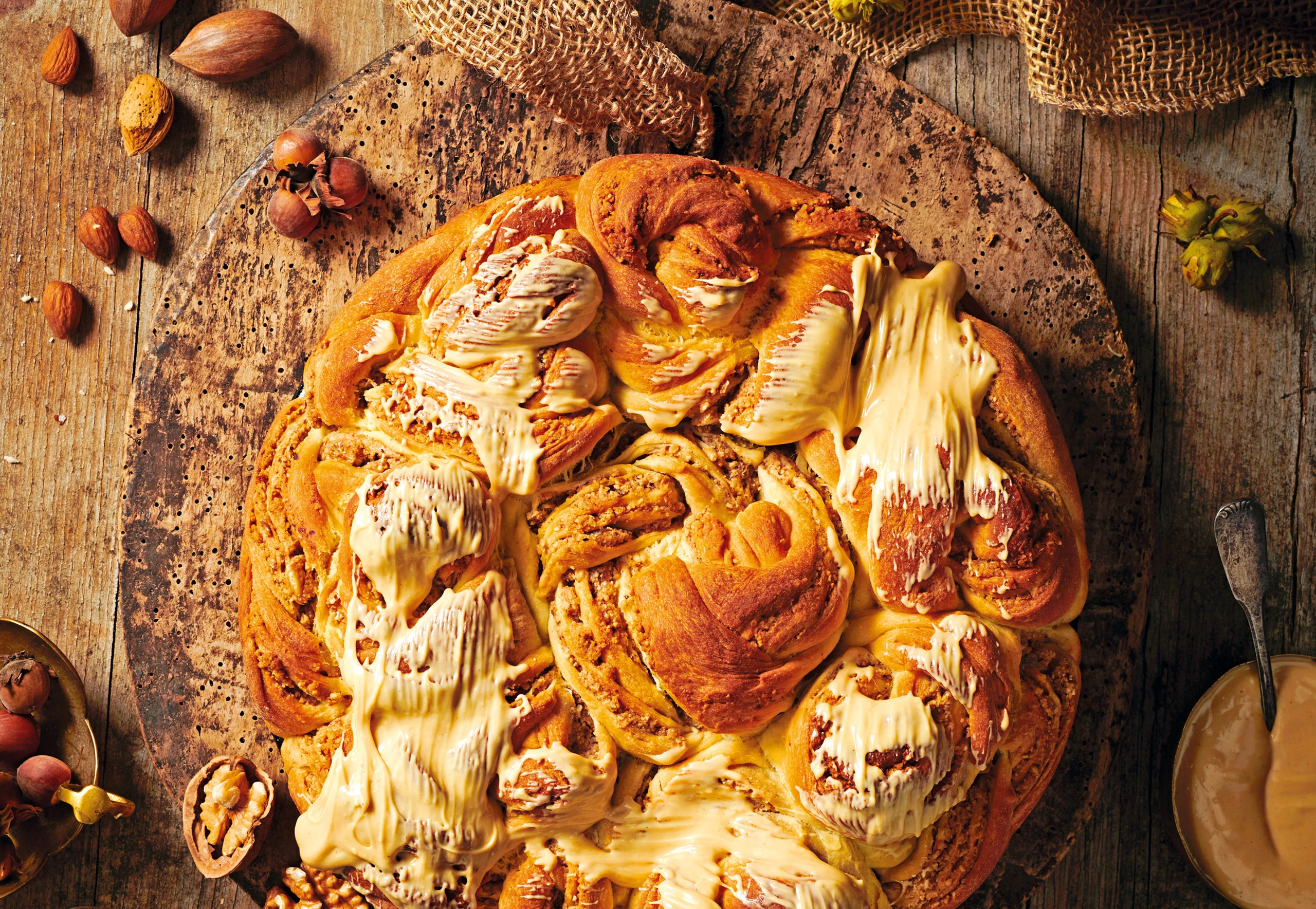Für die Glasur Kuvertüre und Erdnussbutter über einem Wasserbad schmelzen. Brioche mit der Glasur bestreichen und noch warm genießen.
