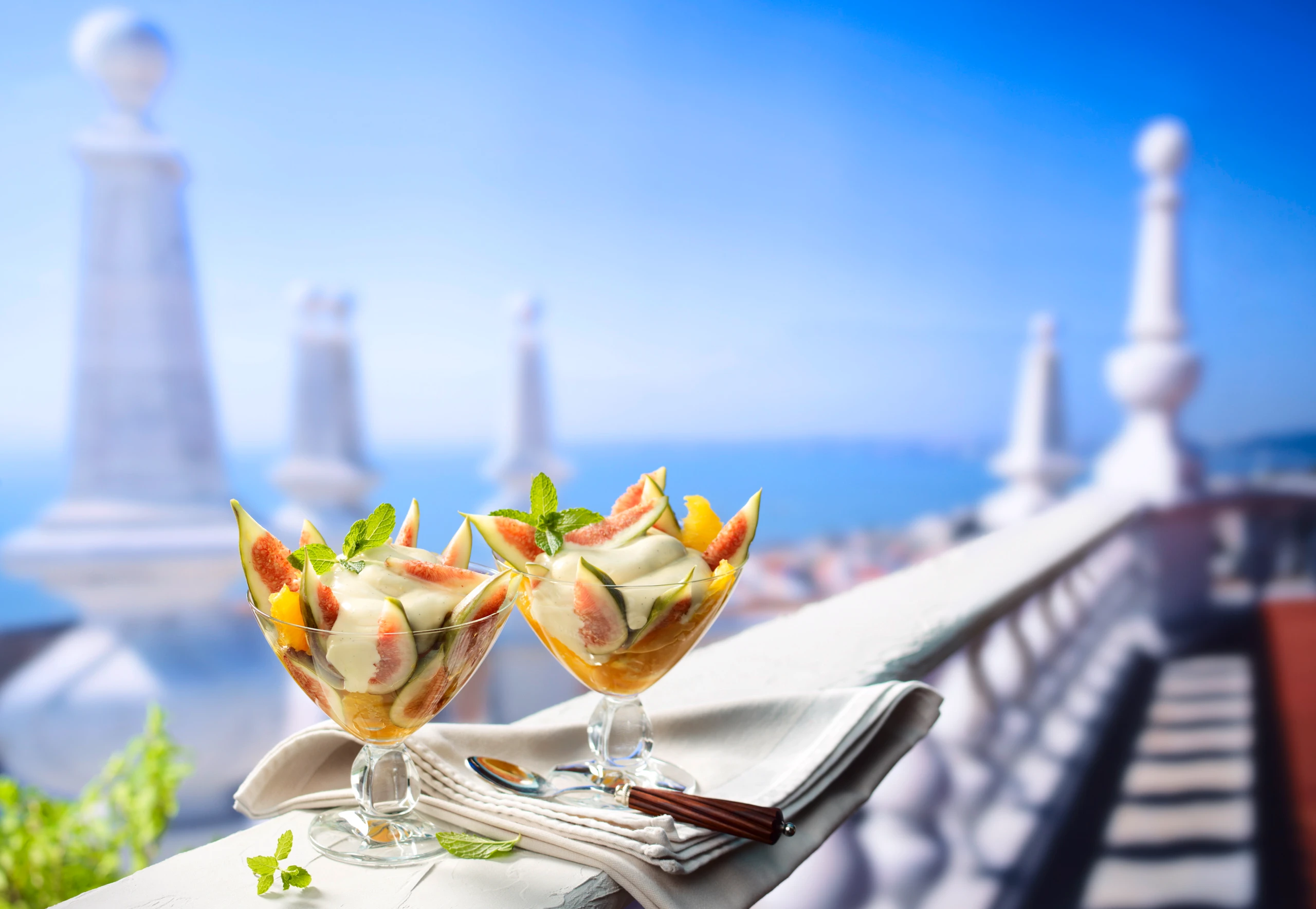 Feigen in Spalten schneiden, mit den Orangen vermischen. Salat in Gläser füllen, Creme darauf verteilen, mit Minzeblättchen garniert servieren.
