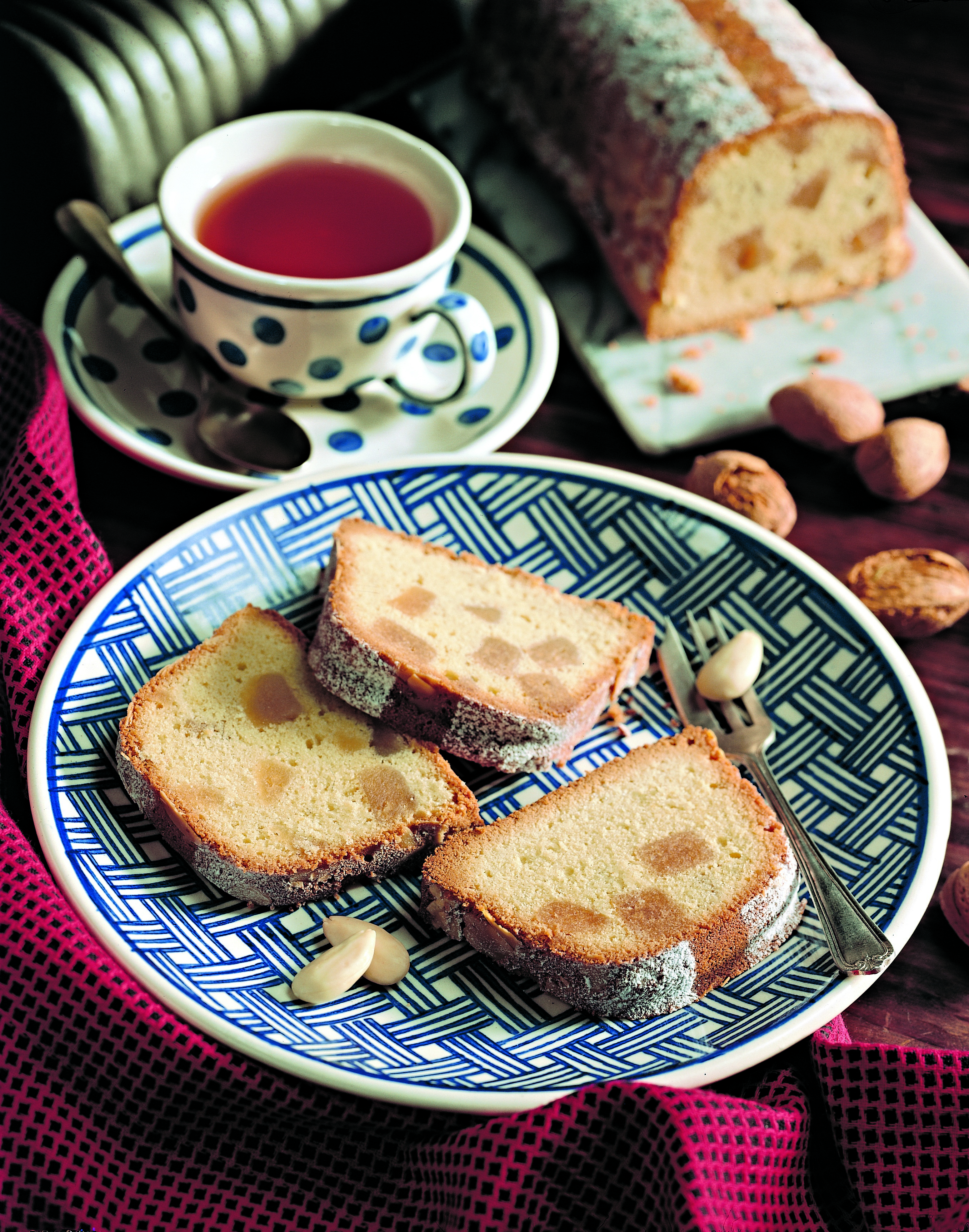 Tiefgekühltes Marzipan in ca. 1 cm große Würfel schneiden und mit dem Mehl vermischen (damit sie nicht aneinanderkleben). Eiklar mit Kristallzucker und Stärkemehl zu cremigem Schnee schlagen und abwechselnd mit den Marzipanwürfeln unter den Abtrieb heben. Masse in die vorbereiteten Formen füllen, gleichmäßig verteilen und im vorgeheizten Rohr (mittlere Schiene / Gitterrost) 55–60 Minuten backen.
