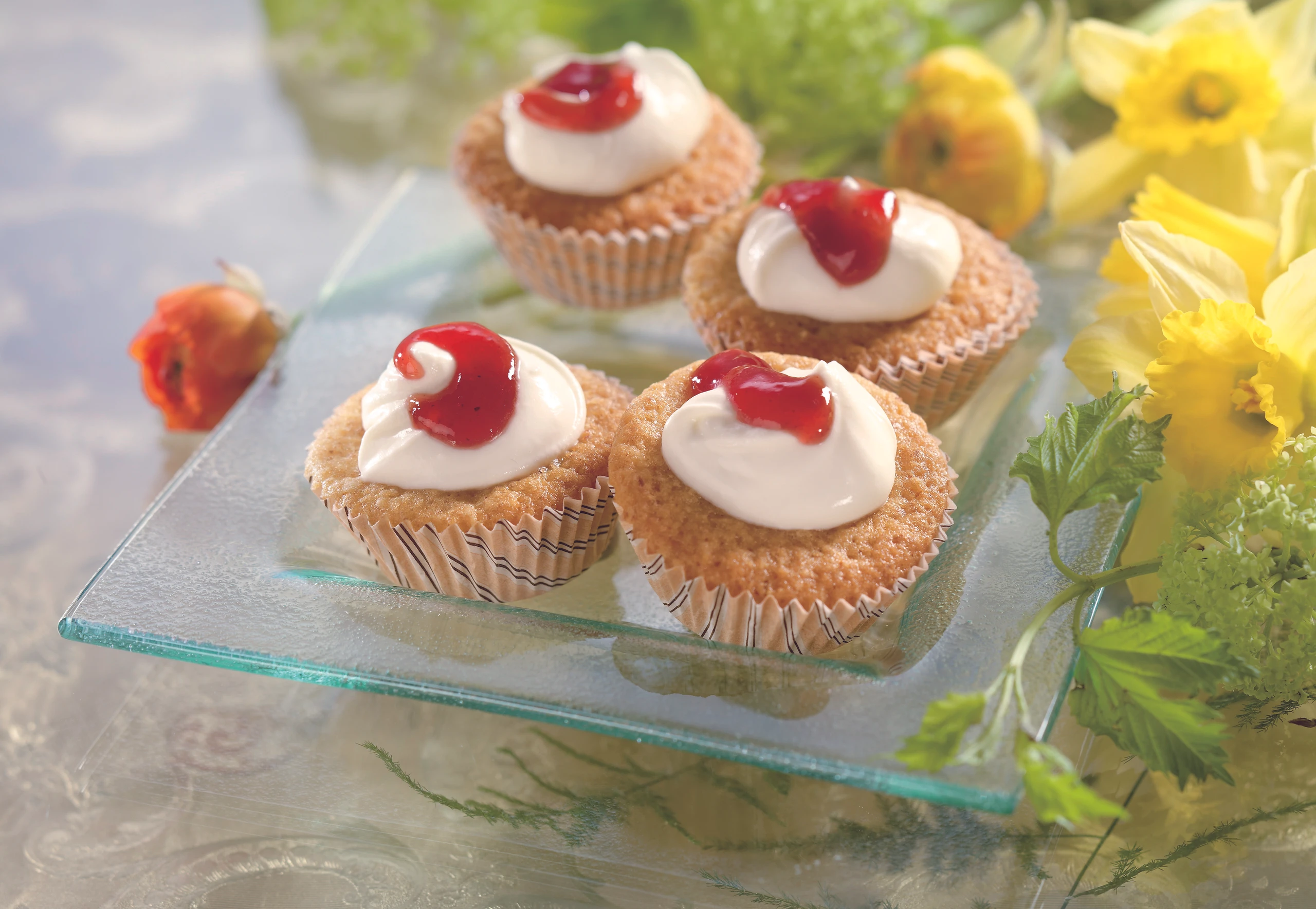 Für das Topping Topfen mit Staubzucker verrühren. Obers schlagen und unterheben. Topping auf den Muffins verteilen, einen Tupfer Marmelade darauf geben.