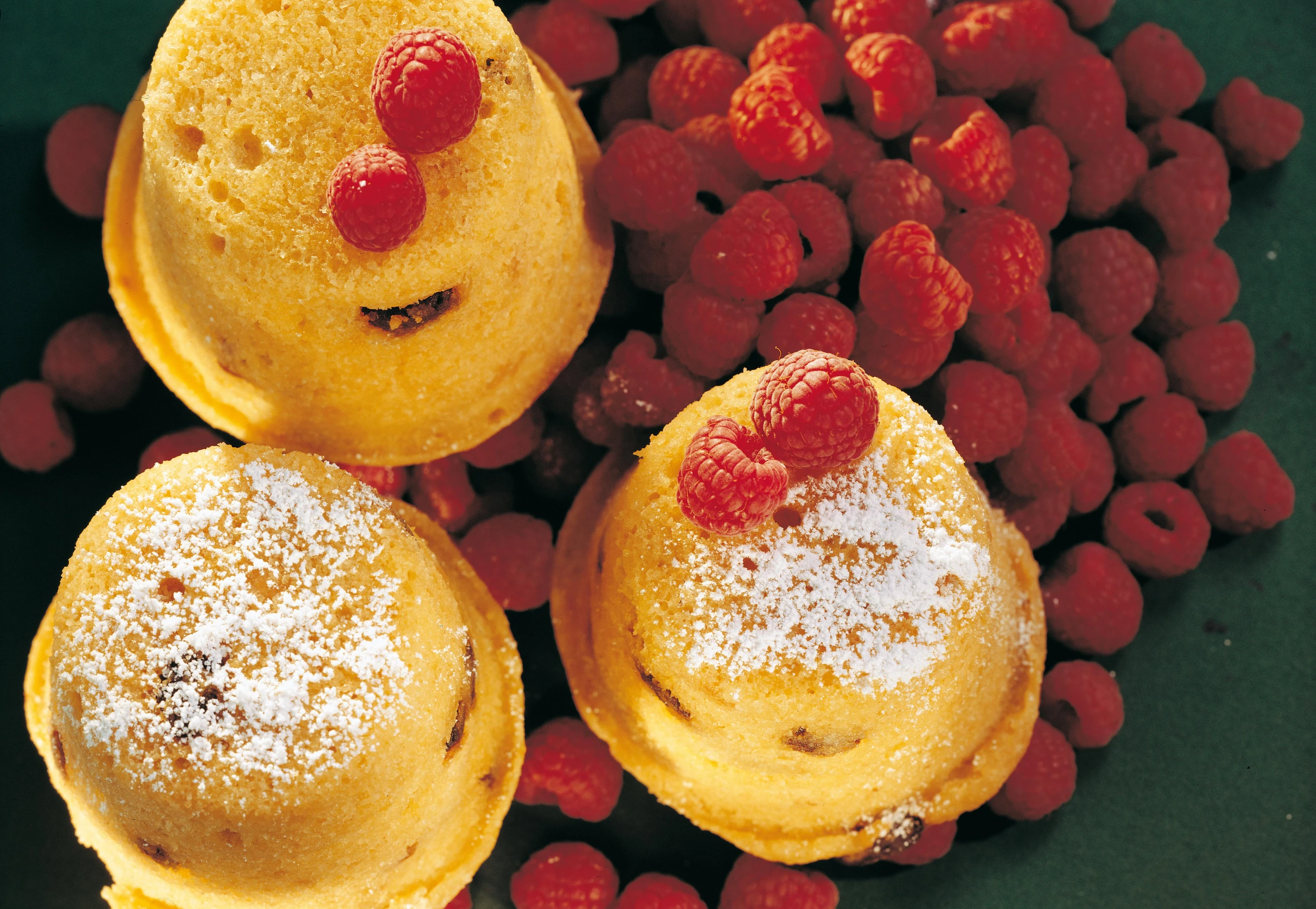 Förmchen (ca. 1/8 l Inhalt) befeuchten (eventuell mit Mandellikör) und mit Kristallzucker ausstreuen. Mandelmasse einfüllen und im Dunst kochen, bis eine eingestochene Nadel rein bleibt. Stürzen und mit Himbeeren servieren.