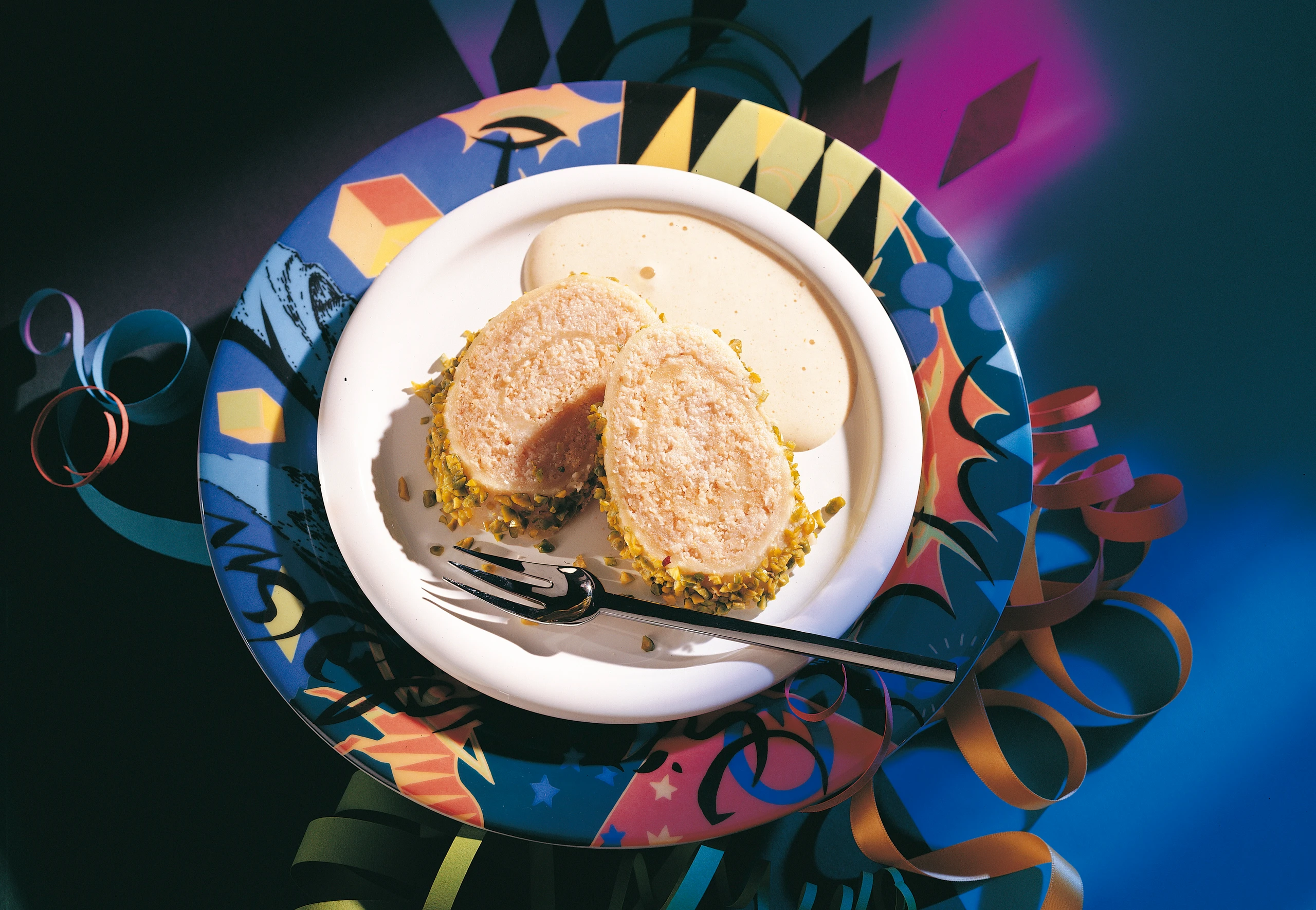 Mandelroulade aus dem Tuch wickeln und in den Pistazien wälzen. Roulade kurz rasten lassen, in Scheiben schneiden, anrichten und mit Staubzucker bestreuen.
