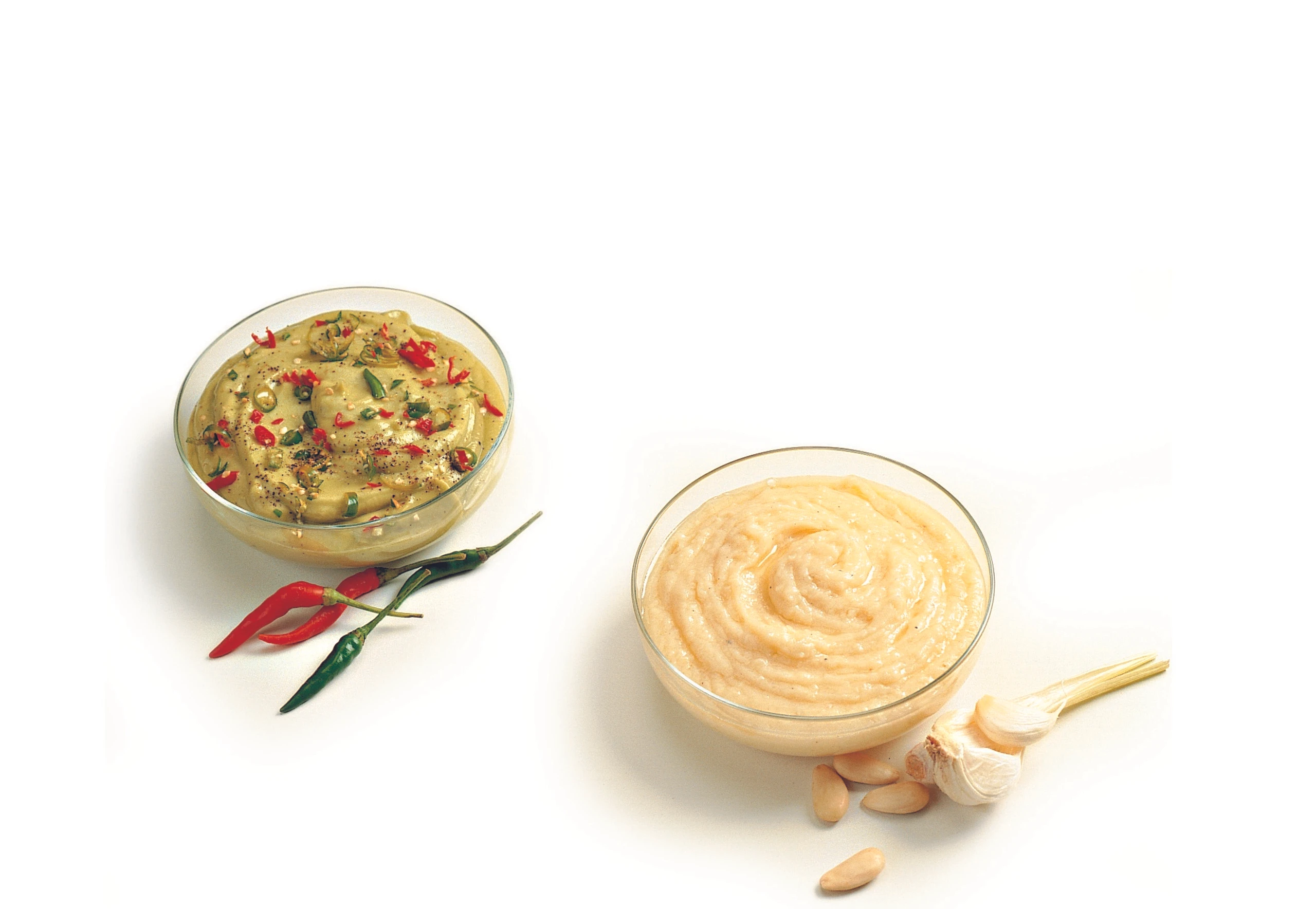 Erdäpfel kochen. Knoblauch schälen. Mandeln, Knoblauch, Essig, Öl und Salz pürieren. Erdäpfel schälen, pürieren, mit den restlichen Zutaten vermischen und kalt stellen.