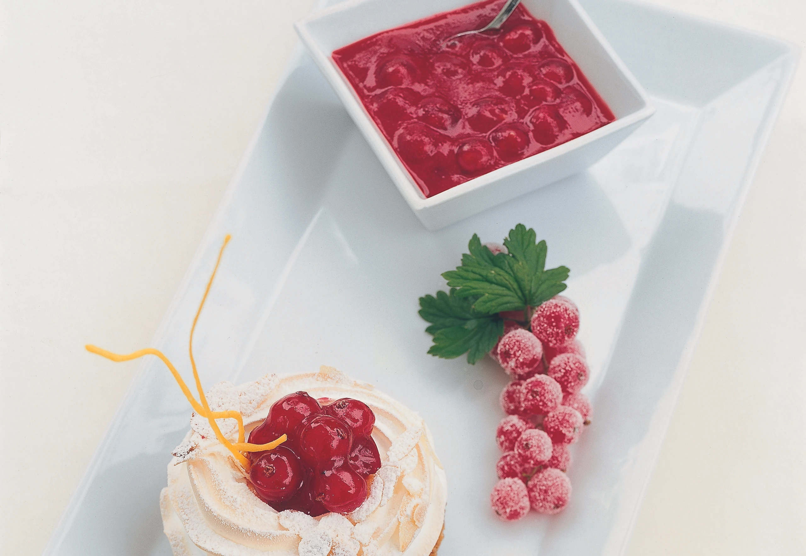 Mandelschaumtörtchen mit Ribisel-Erdbeersauce