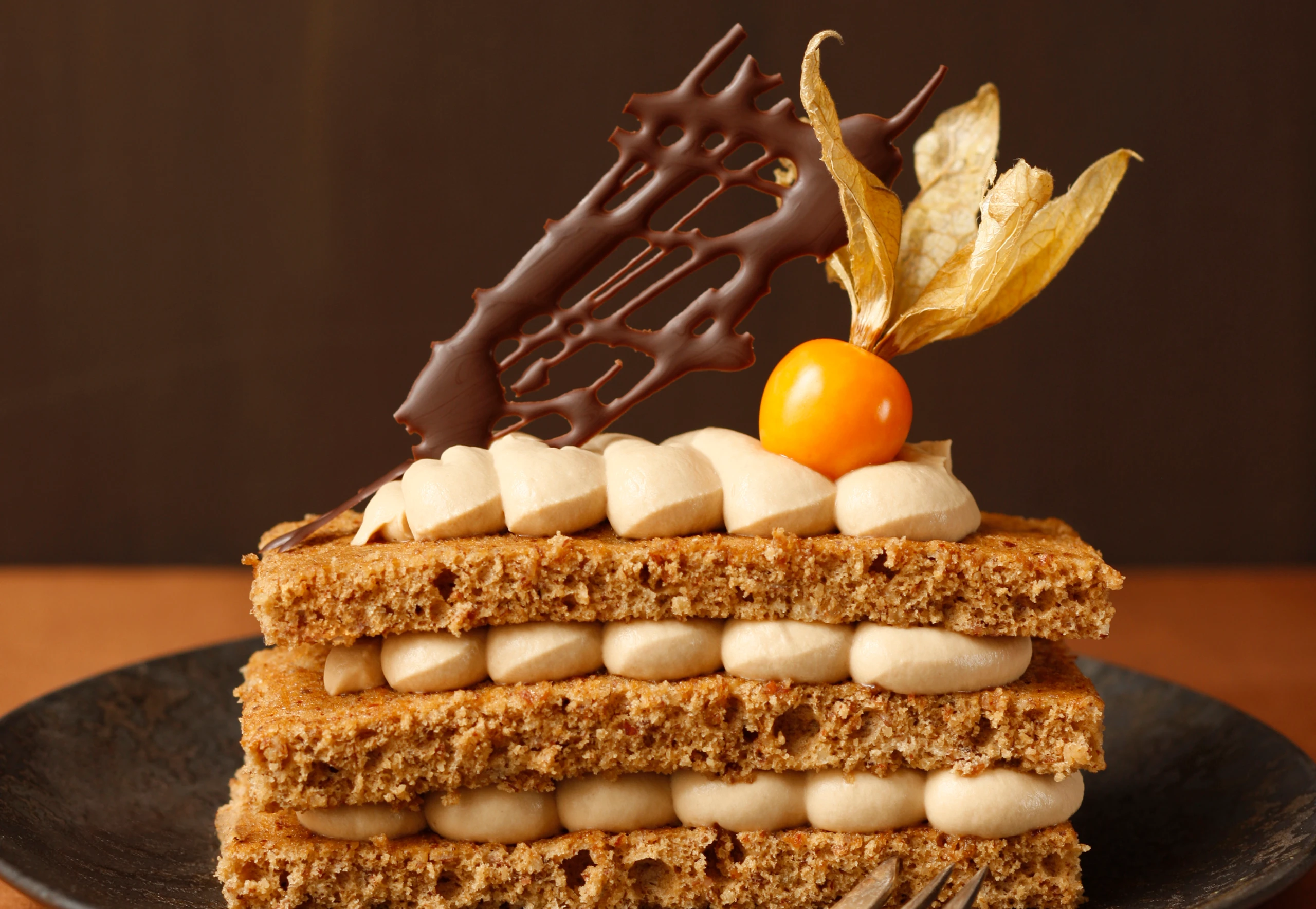 Espressomasse cremig aufschlagen, in einen Dressiersack füllen und wellenförmig auf die Teigstücke dressieren. Je 3 davon übereinandersetzen. Schokodekor in Stücke brechen. Schnitten mit Physalis und Dekor garnieren.