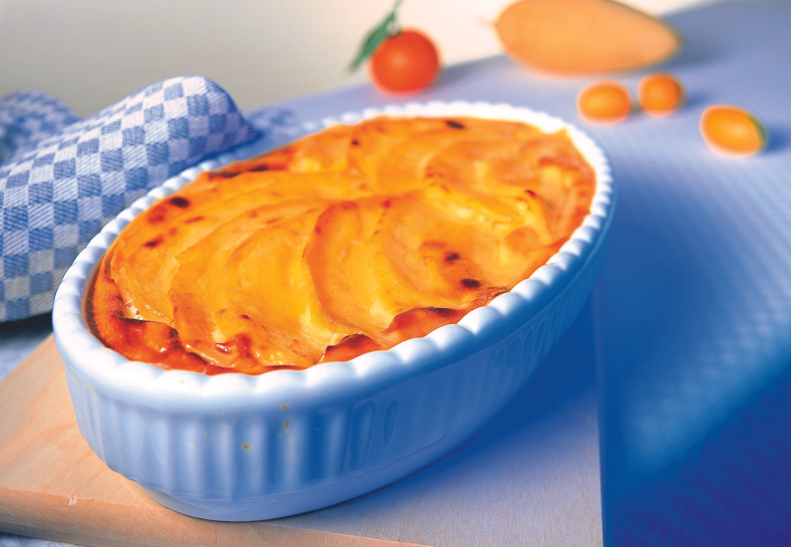 Joghurt, Ei, Zimt und Süßstoff verquirlen, über die Mango gießen und ca. 20 Minuten (mittlere Schiene / Gitterrost) backen.