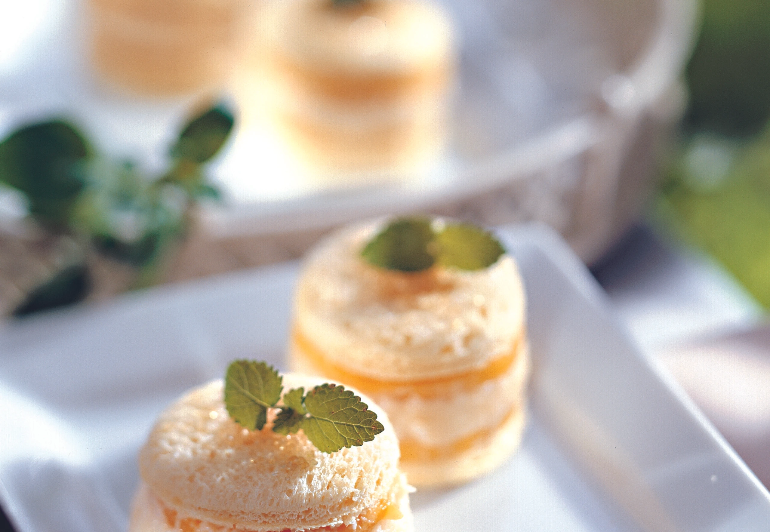 Creme in einen Dressiersack füllen. Die Hälfte der Brioches mit je 1 Mangoscheibe belegen, Creme darauf dressieren. Mit je 1 Mango- und Briochescheibe belegen, mit Melisse garnieren.