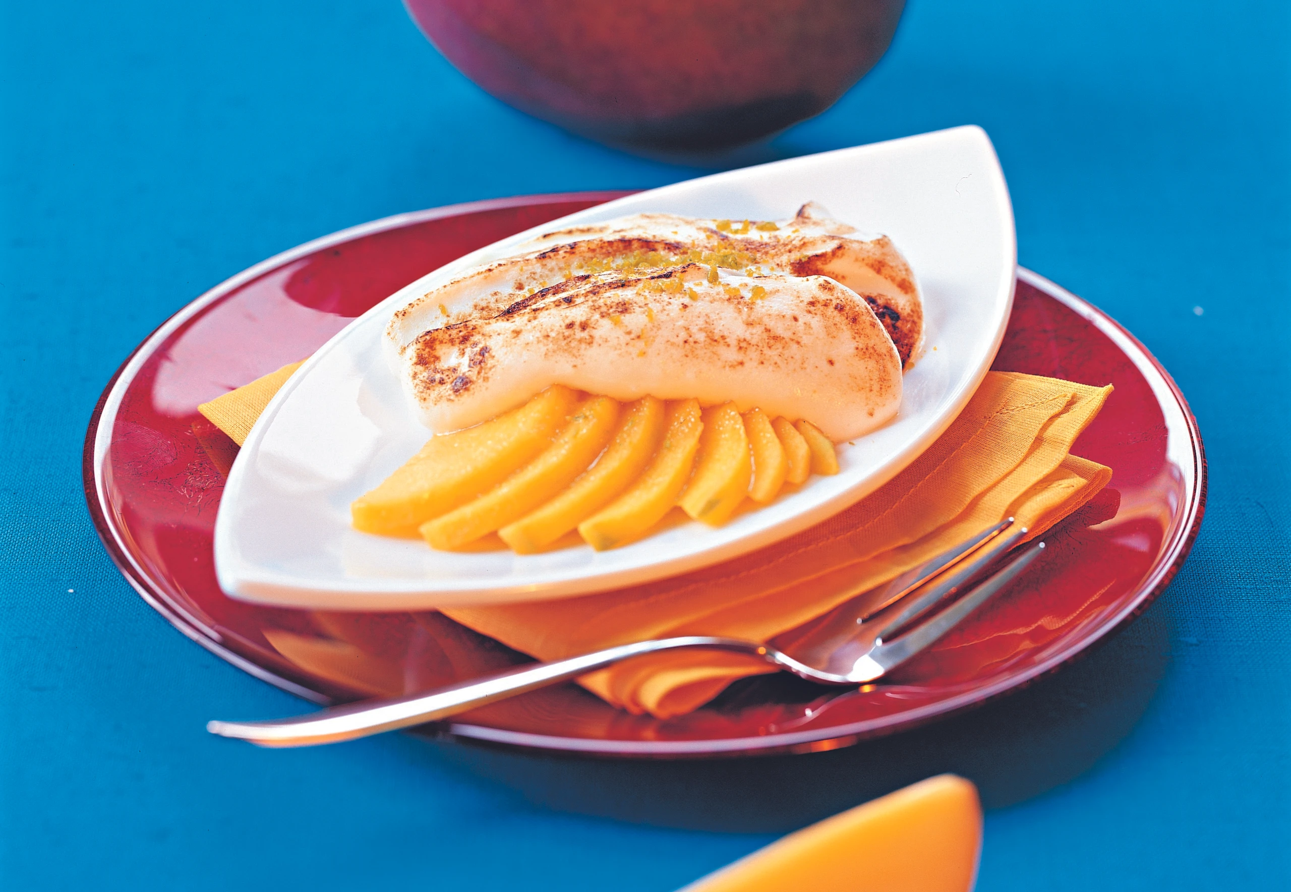 Rohr auf Grillstellung vorheizen (oder Flämmer bereitstellen). Mango schälen, Fruchtfleisch als Hälften vom Kern schneiden. Hälften längs halbieren, längs einschneiden und zu einem Fächer auseinander drücken.