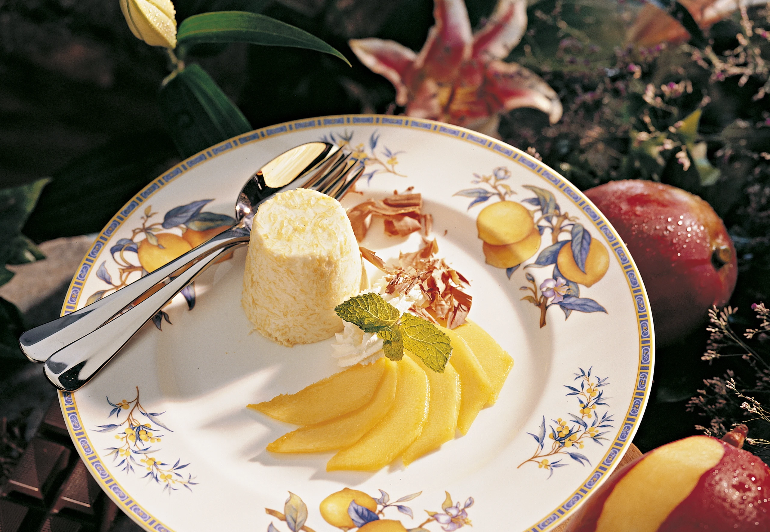 Vor dem Servieren Förmchen kurz in heißes Wasser tauchen. Mangomus auf Teller stürzen und mit den Mangostreifen garnieren.