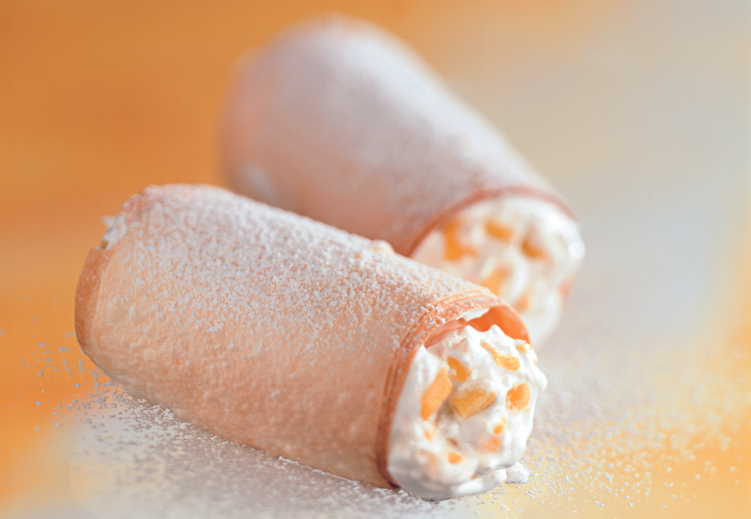 Mango schälen, Fruchtfleisch vom Kern schneiden und in sehr kleine Würfel schneiden. Mangostücke trockentupfen und in die Schneemasse rühren. Masse in einen Dressiersack mit großer Tülle füllen und in die Schaumrollen dressieren.