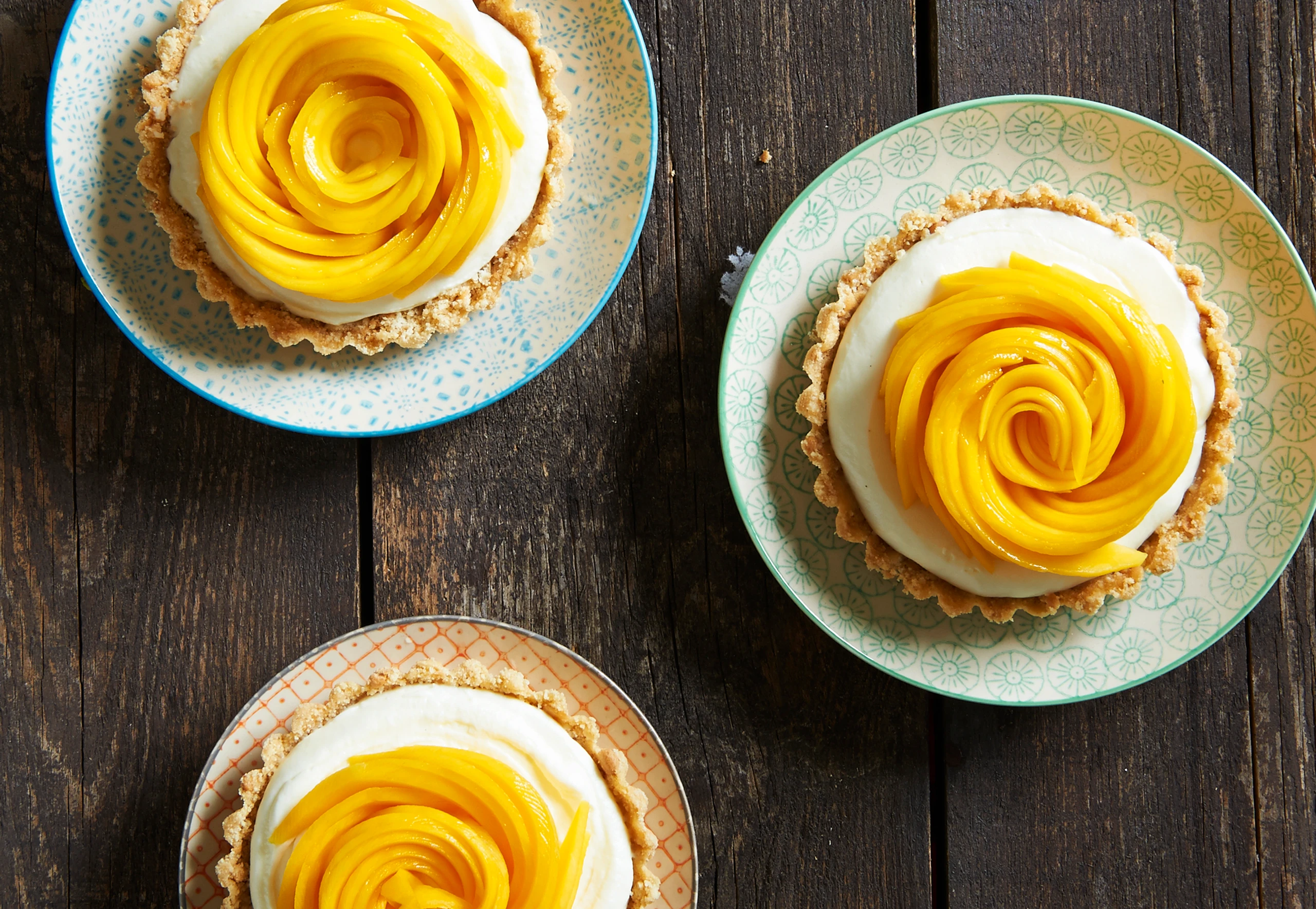 Mangos schälen, beide Hälften vom Kern schneiden und fein blättrig schneiden. Zu Rosen formen und auf die Tartelettes setzen.