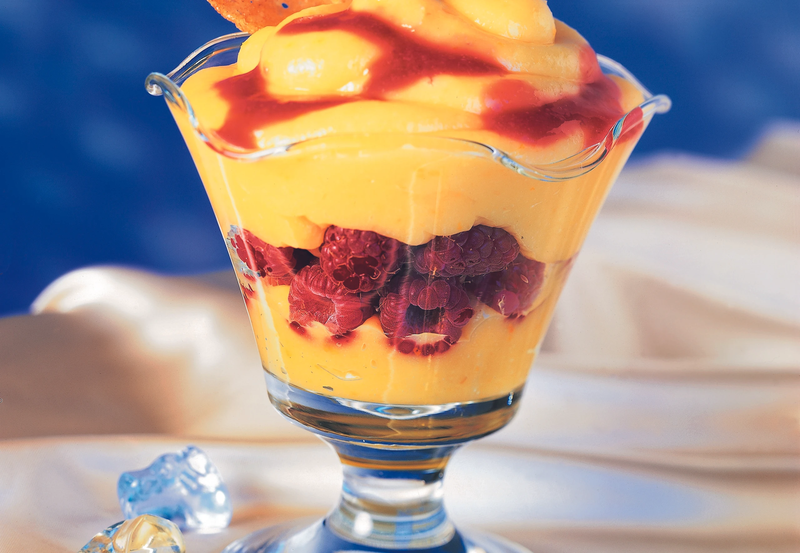 Mangocreme mit Himbeeren mit Mandelplätzchen