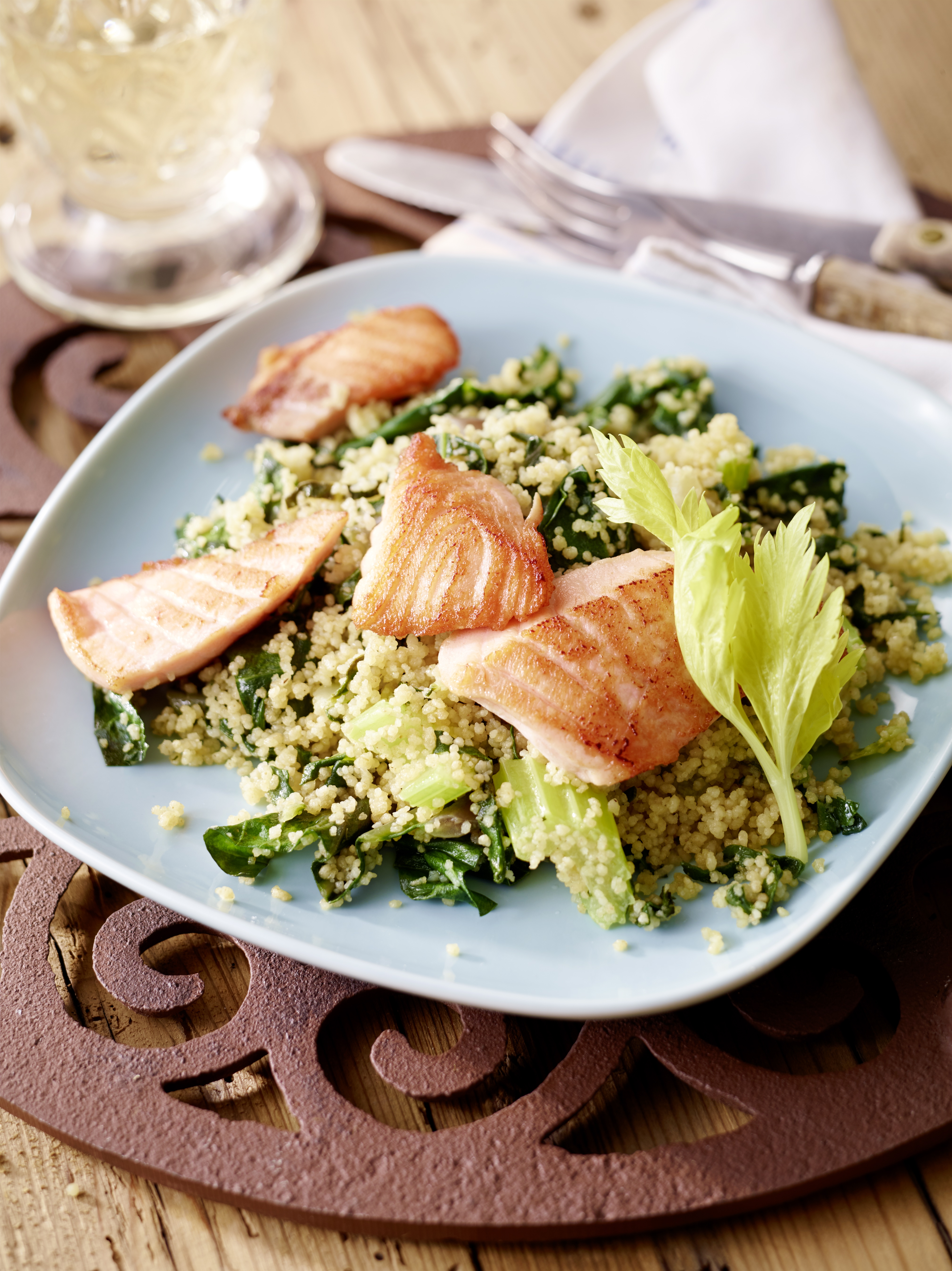 - Lachs in ca. 3 cm große Stücke schneiden, salzen, pfeffern und im übrigen Öl rundum braten, aus der Pfanne nehmen und mit dem Couscous anrichten.