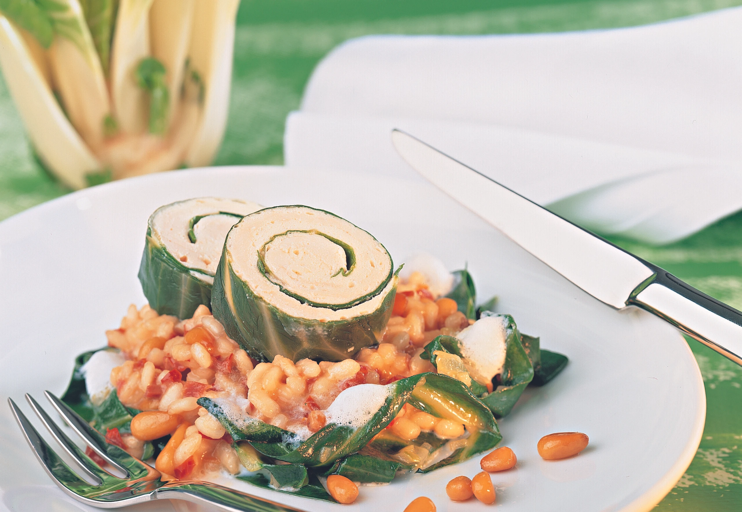 Mangold-Hühnerröllchen mit Paradeis-Risotto