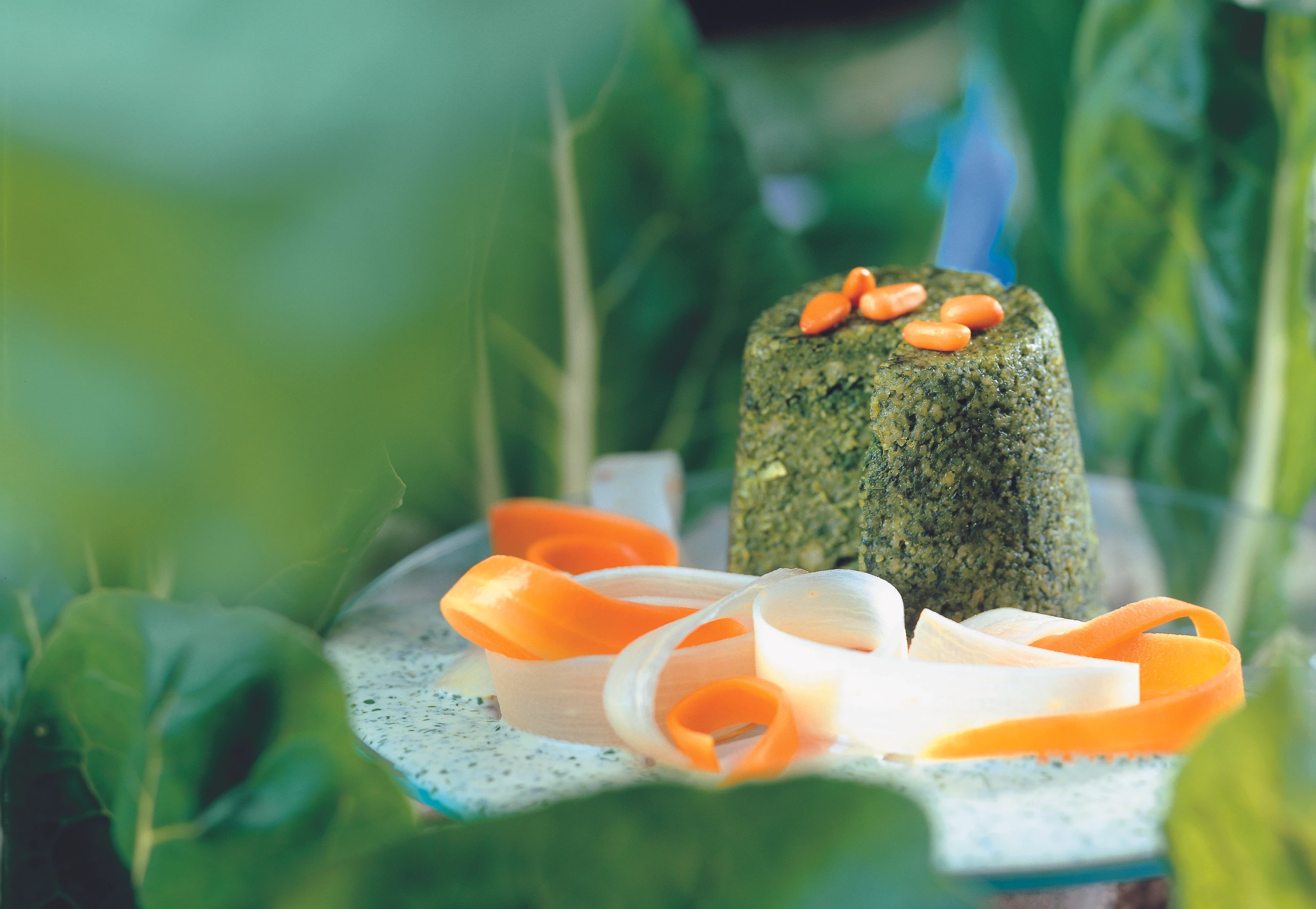 Förmchen aus dem Rohr nehmen, die Mangoldflans ein paar Minuten rasten lassen, auf Teller stürzen, mit den Gemüsenudeln und der Kressesauce (siehe Rezepte) servieren.