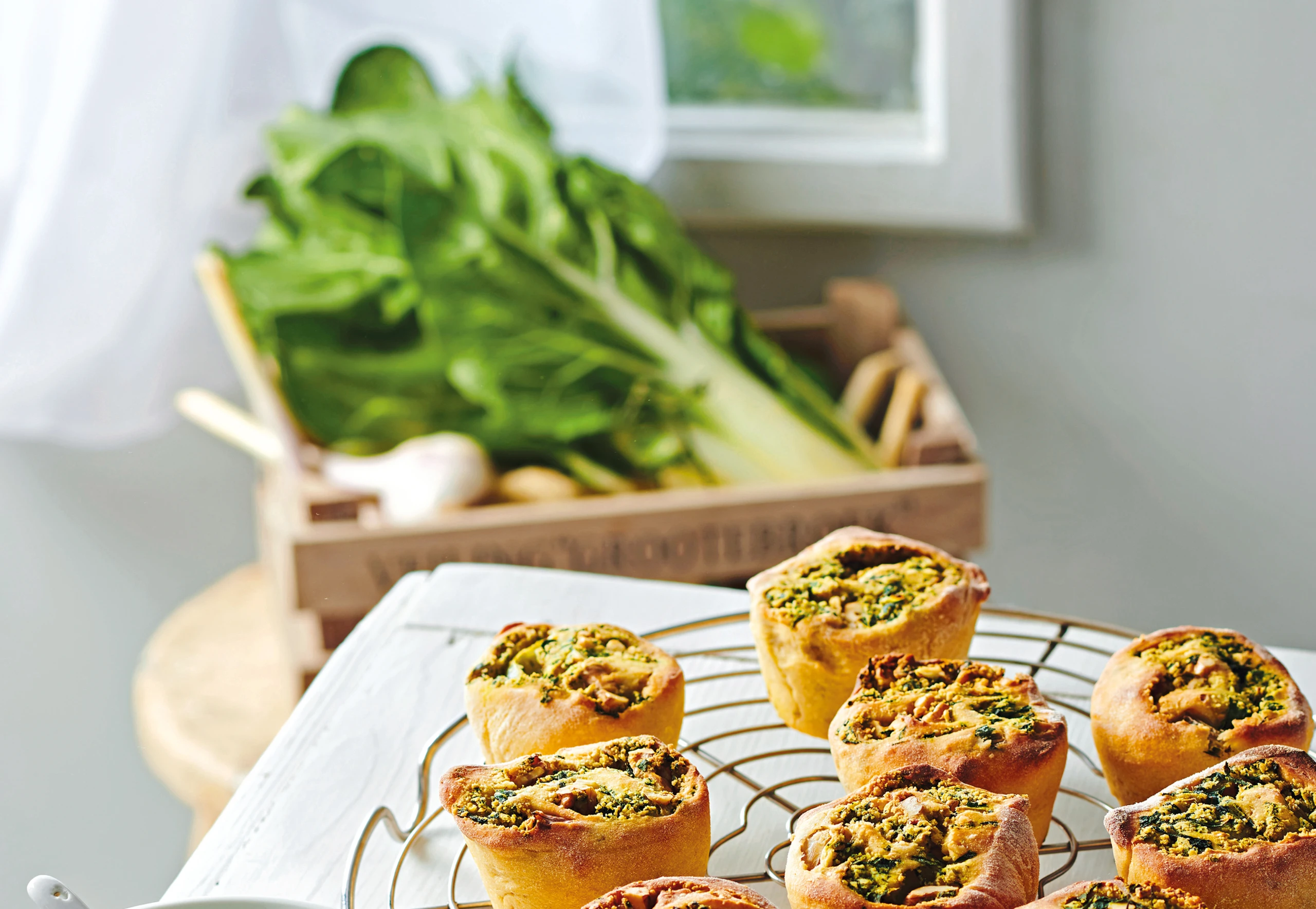 Muffinblech (12 Förmchen) mit Öl ausstreichen. Teig auf einer bemehlten Arbeitsfläche ausrollen (40 x 30 cm). Auf zwei Drittel der Teigfläche die Fülle verstreichen. Teig über die Fülle eng einrollen. Rolle quer in 12 Scheiben schneiden. Scheiben in die Förmchen legen und abgedeckt ca. 30 Minuten gehen lassen. Rohr auf 200°C vorheizen.