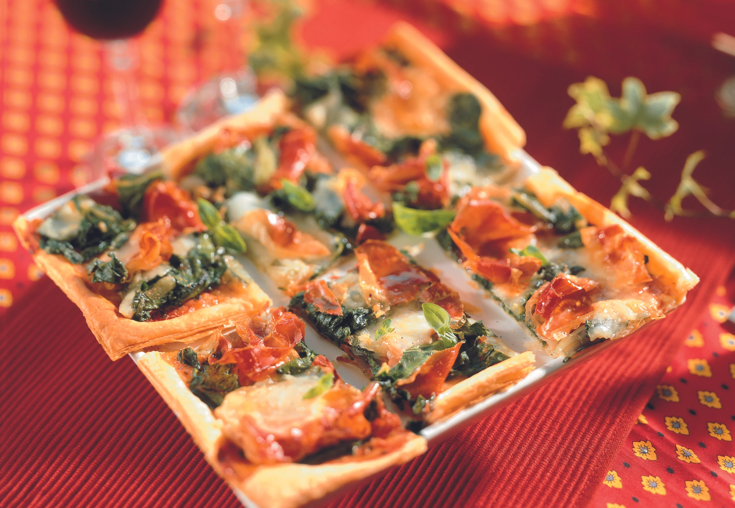 Teig mit Paradeisern bestreichen, mit Mangold, Mozzarella und Prosciutto belegen. Teig im Rohr (mittlere Schiene) ca. 25 Minuten backen. Vor dem Servieren eventuell mit frischem Oregano bestreuen.