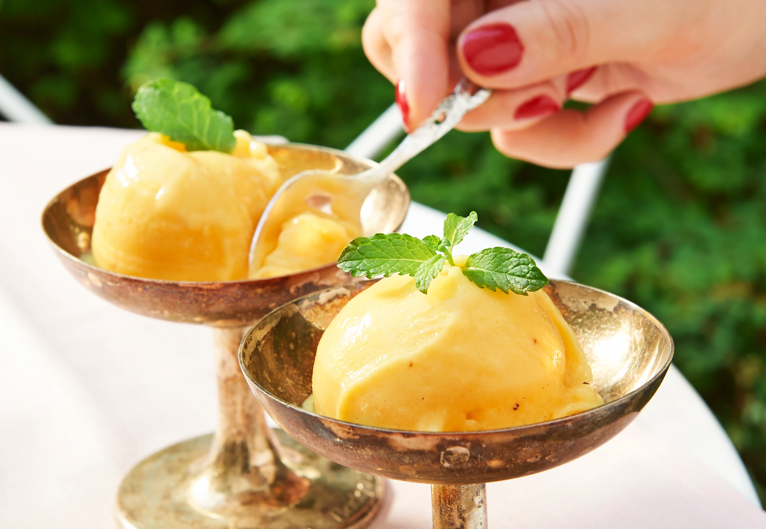 Früchte mit Honig und Joghurt pürieren und ca. 1 Stunde tiefkühlen. Sorbet portionieren und eventuell mit Minze garniert servieren.