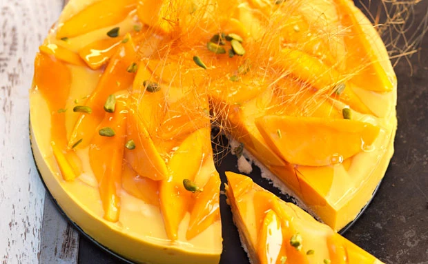 - Tortengelee laut Anleitung zubereiten. Torte aus der Form lösen, mit den übrigen Mangostücken belegen, mit Gelee bestreichen und für ca. 30 Minuten kühl stellen. Vor dem Servieren mit Engelshaar und Pistazien garnieren.