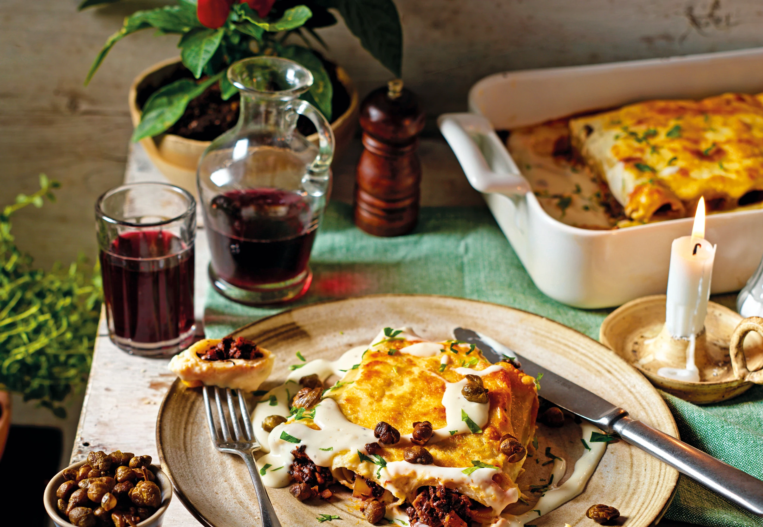 Ein Drittel von der Béchamelsauce in der Form verstreichen und 4 EL von der Fülle darauf verteilen.