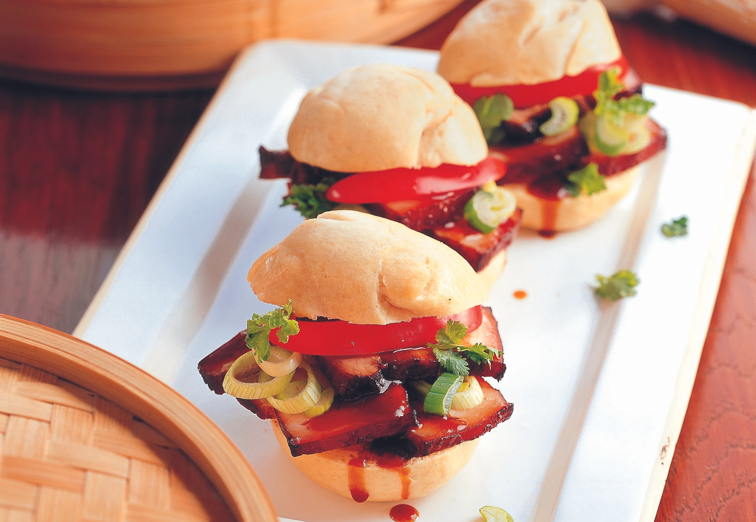 Die heißen Brötchen aufschneiden, mit Schweinebraten, Paprika und Jungzwiebeln füllen und mit der Sauce beträufeln.