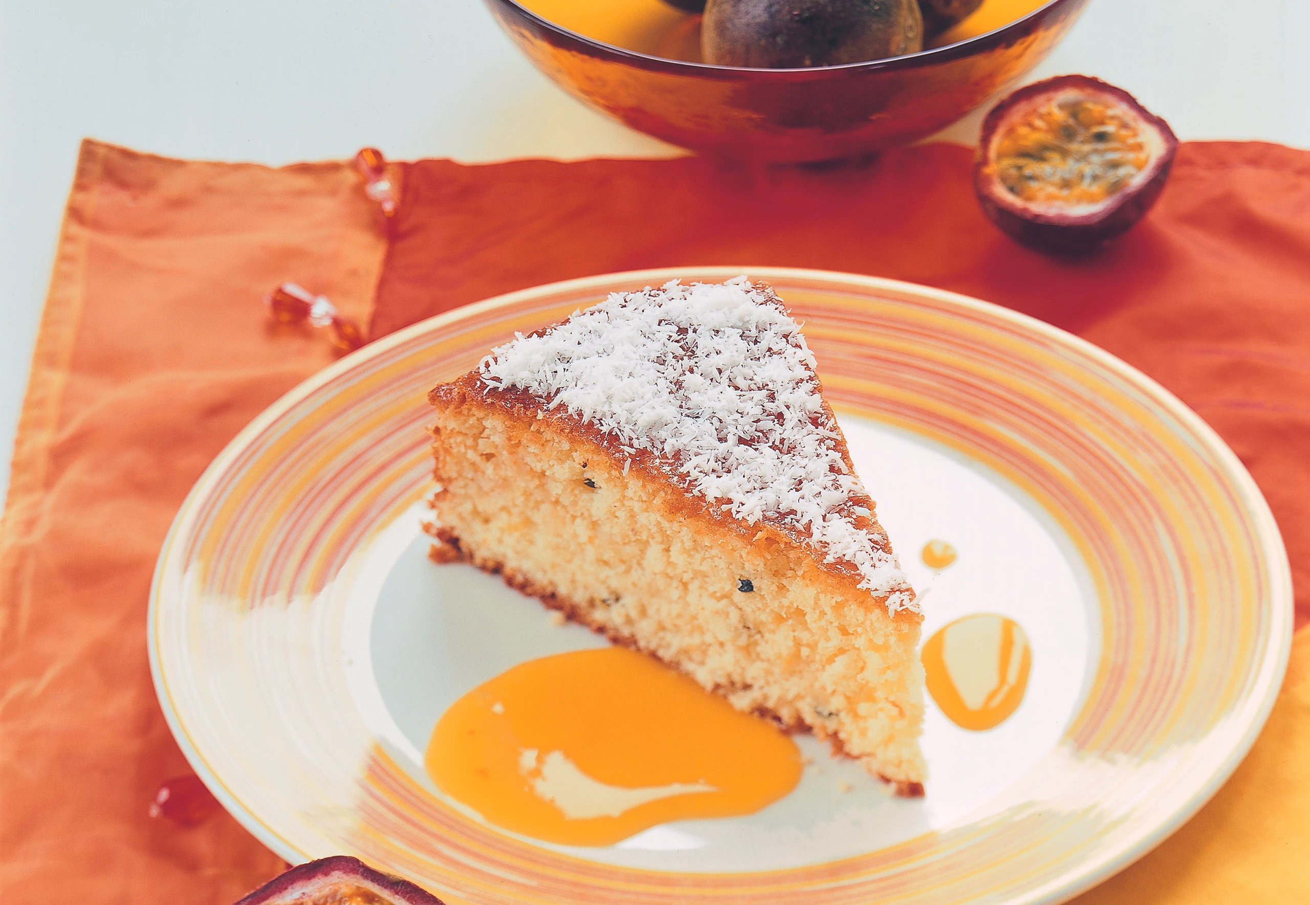 Torte aus dem Rohr nehmen und in der Form auskühlen lassen. Torte aus der Form nehmen, die Oberfläche dünn mit Honig einstreichen und mit Kokosette bestreuen. Torte mit der Passionsfrucht-Sauce servieren.