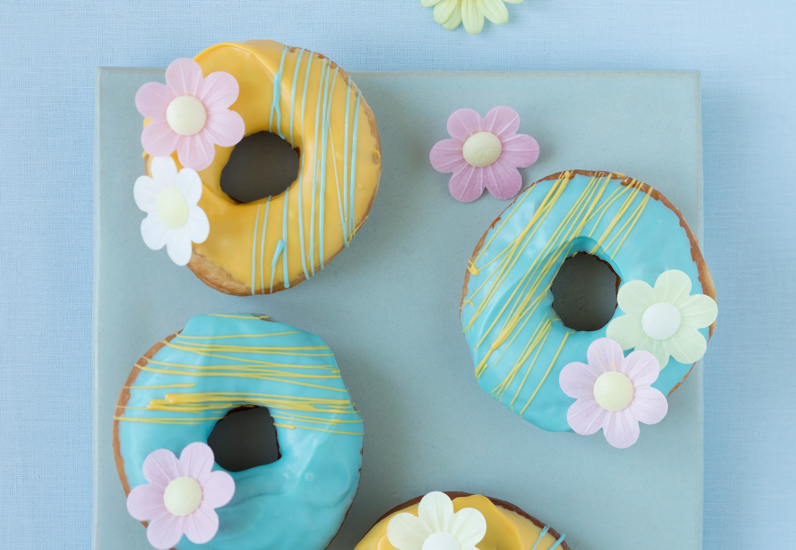 Für die Garnitur Fettglasuren getrennt über Dampf schmelzen. Jeweils 8 Donuts mit der Oberseite nach unten in die gelbe und blaue Glasur tauchen. Donuts wenden und mit Glasurstreifen und Dekorblüten garnieren. Glasur fest werden lassen.