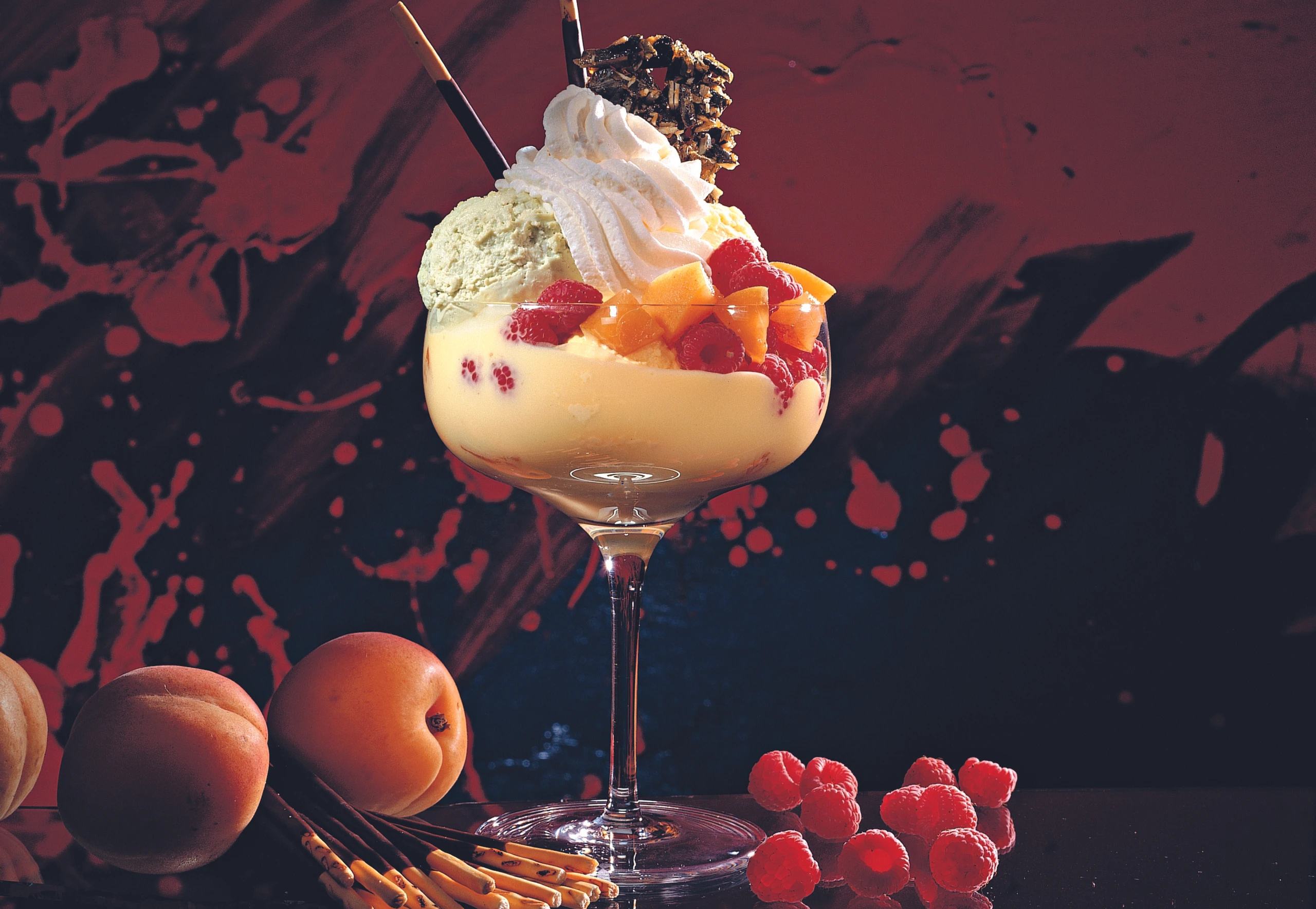 Eis mit Obers, restlichen Früchten, Krokant und Keksstangerln garnieren.