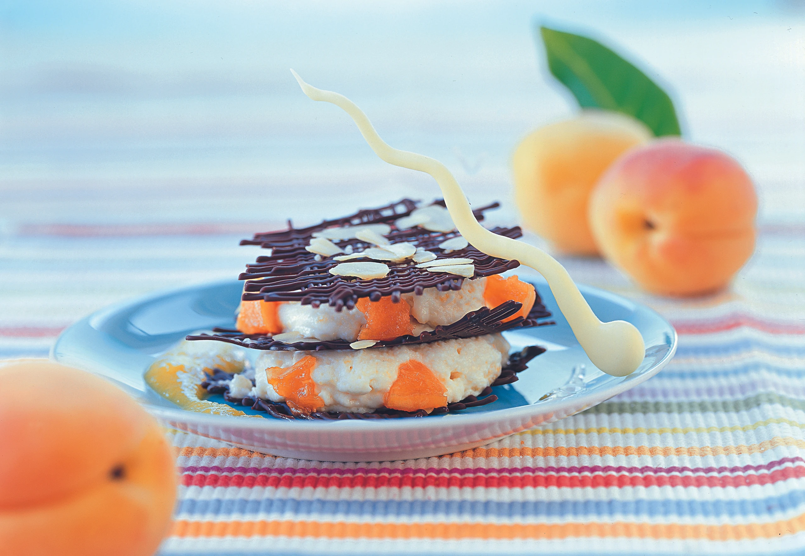 - Ein Schokogitter auf den Teller geben, ca. 1 EL Joghurtcreme und einige Marillenstücke darauf verteilen, mit einem weiteren Schokogitter, Creme, Fruchtstücken bedecken, mit einem Schokogitter abschließen. Dessert mit Marillenmus und Joghurt garnieren. Eventuell zusätzlich mit einem Ornament aus weißer Schokolade (siehe Tipp) dekorieren.