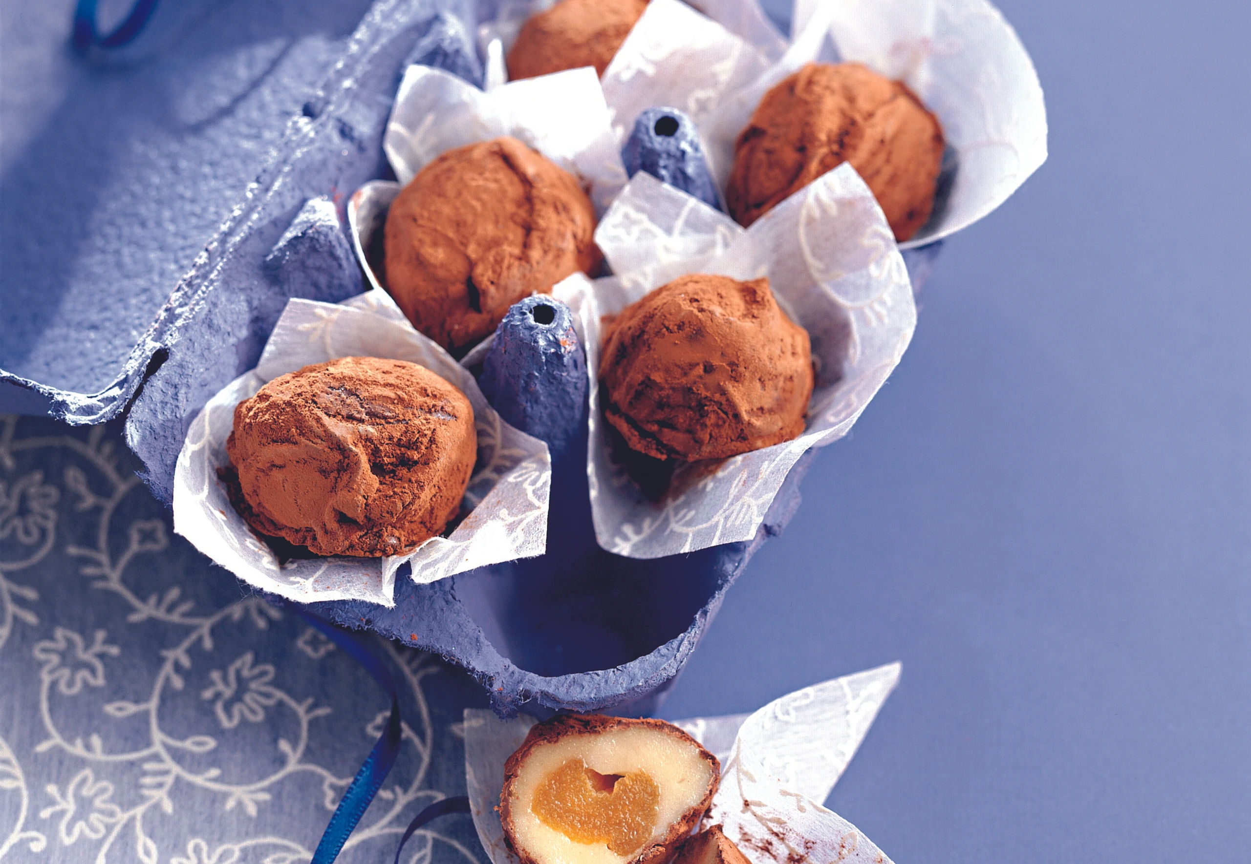 Marzipan mit Eierlikör verkneten und zu einer Rolle formen. Ca. 20 g schwere Stücke abschneiden, Marillen rund in Form drücken, mit Marzipan umhüllen und Kugeln formen.
