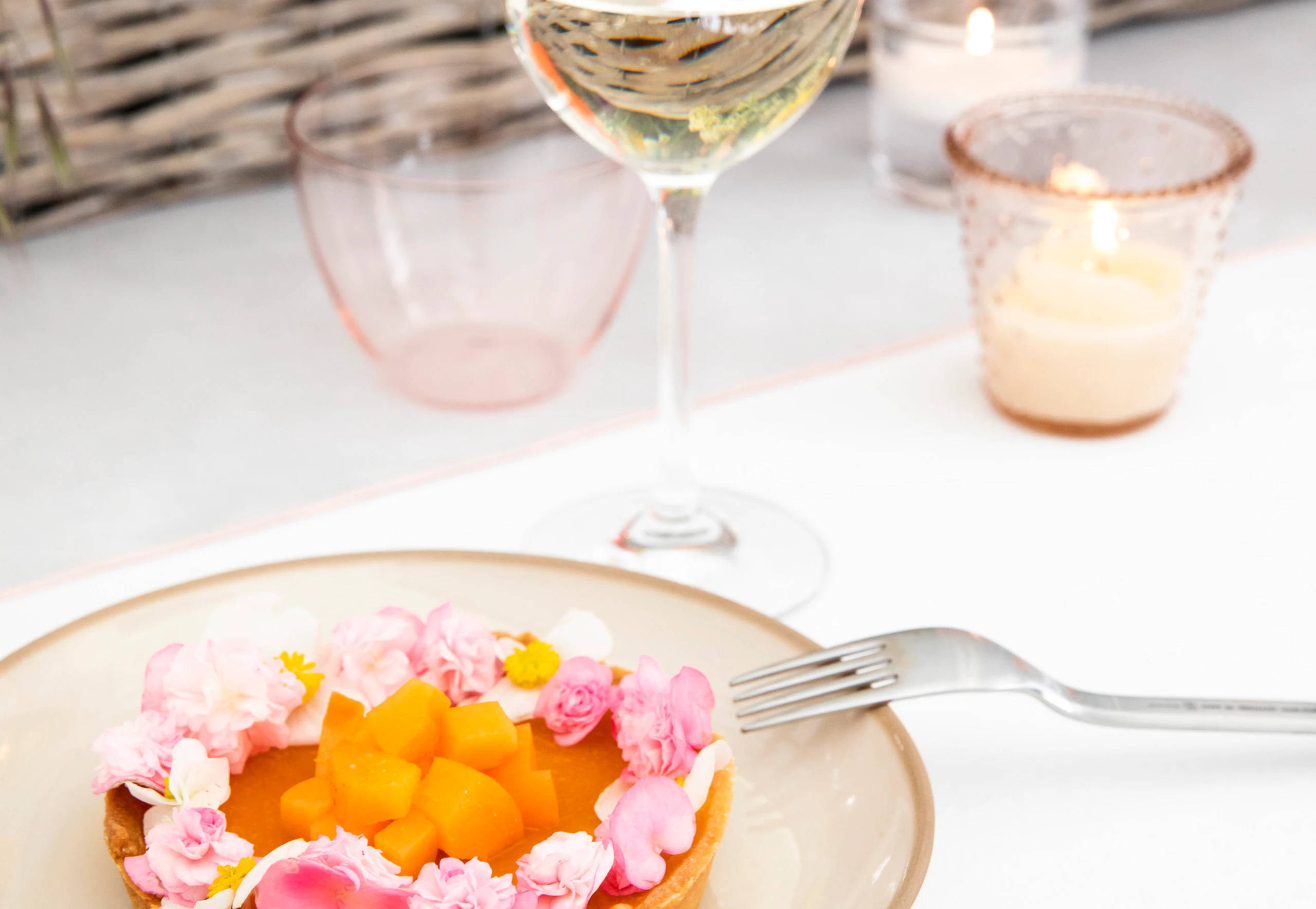 Für die Garnitur Marillen entkernen und in 1 cm große Stücke schneiden. Begonien verlesen. Tartelettes mit Marillenstücken und Begonien garnieren.
